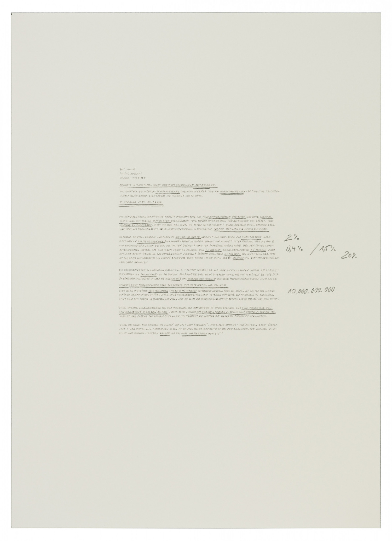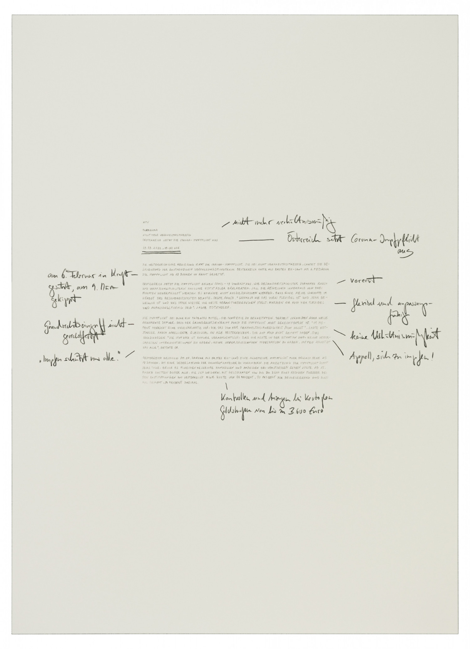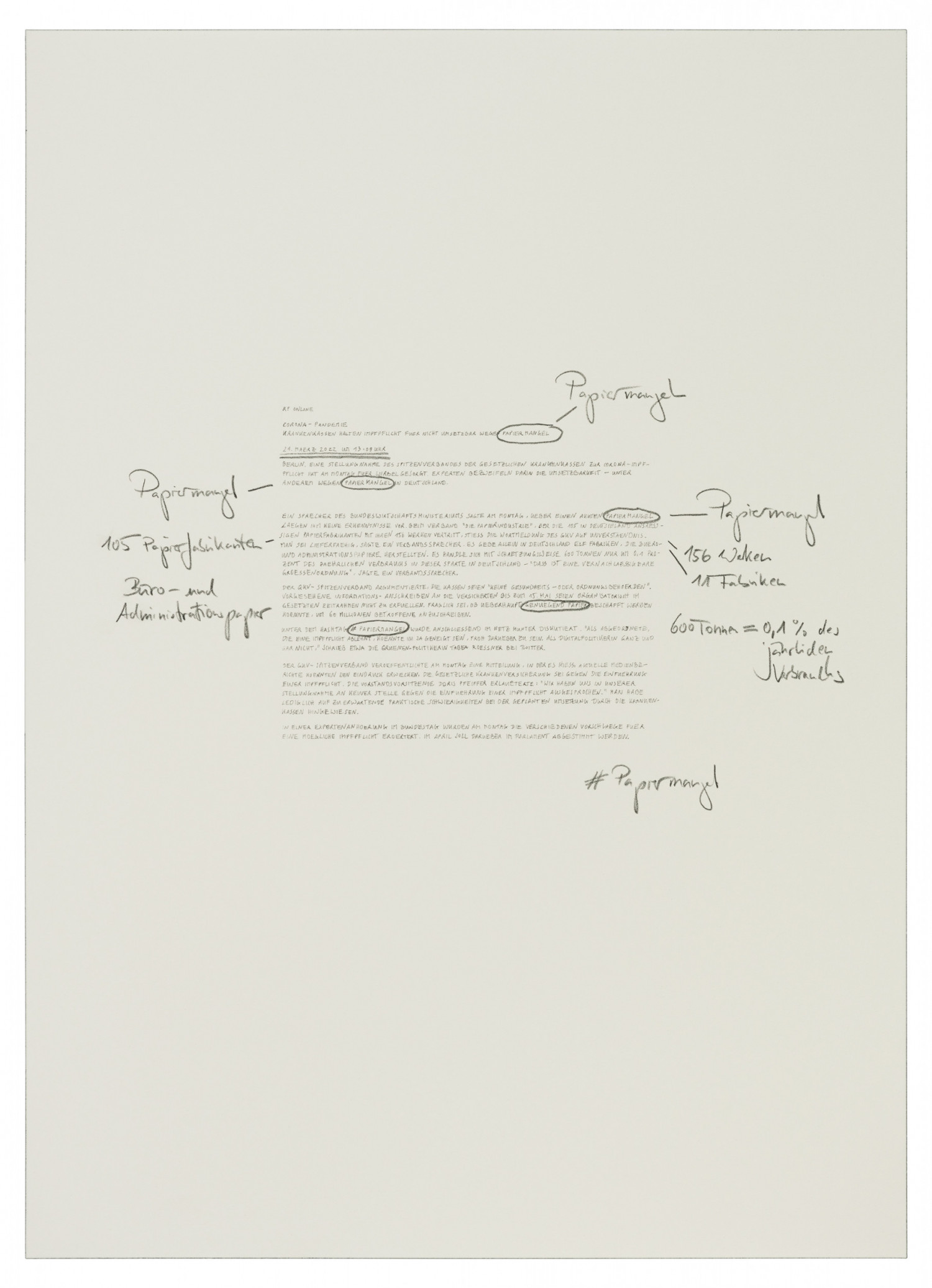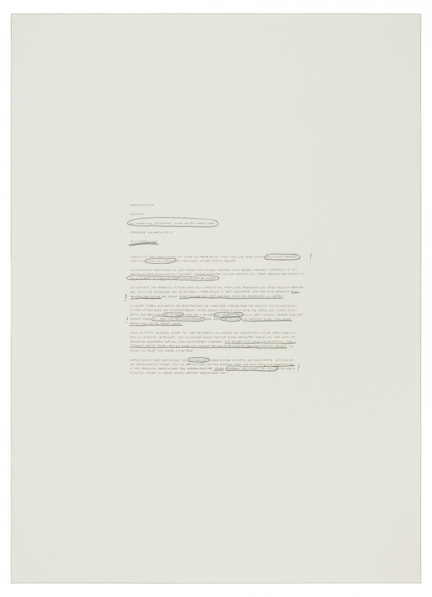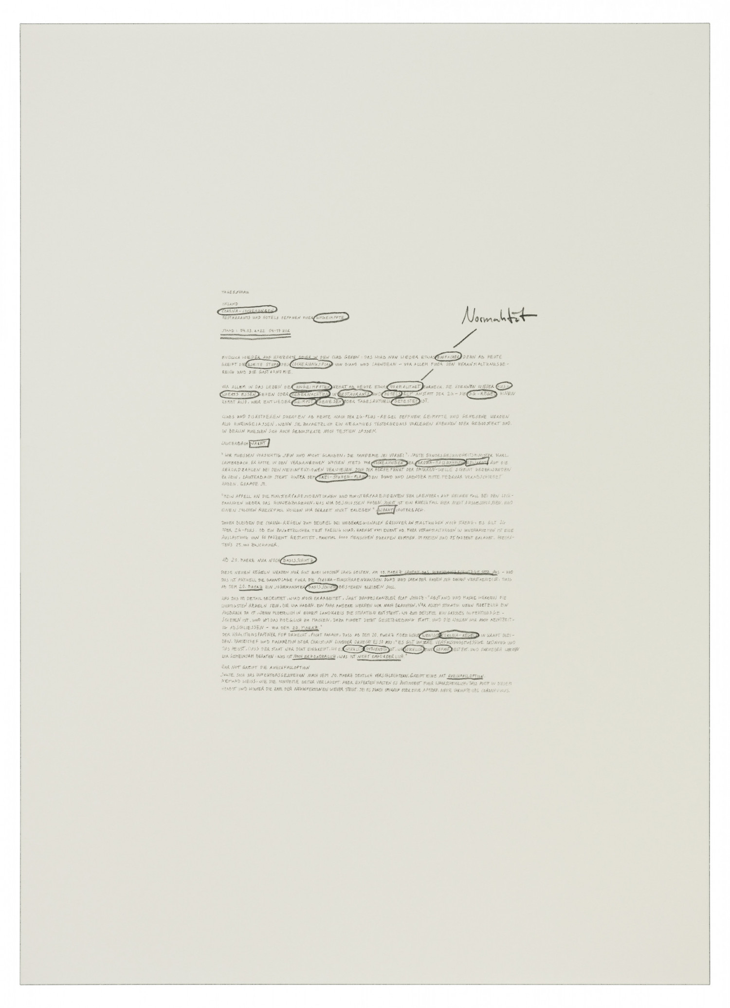 Ich sammle Zeitungsartikel, die online erscheinen, übertrage sie in Druckschrift mit Tusche in die Mitte des Zeichenblattes und bearbeite diese dann mit Bleistift. So setze ich zum Beispiel in Schreibschrift Kommentare ringsum, unterstreiche oder umkreise Passagen, hebe Wörter oder Sätze hervor oder wiederhole einzelne Worte aus den Artikeln.