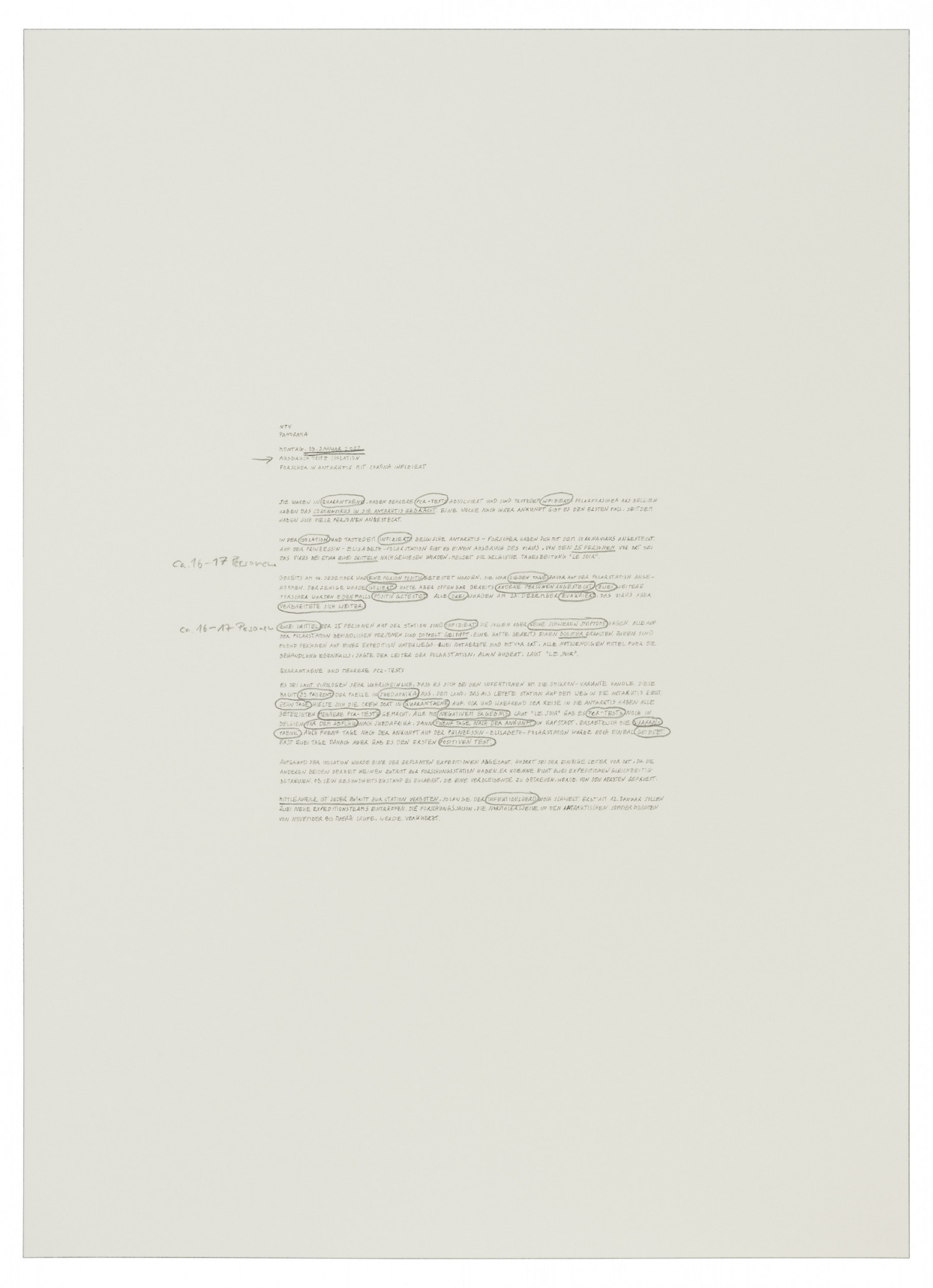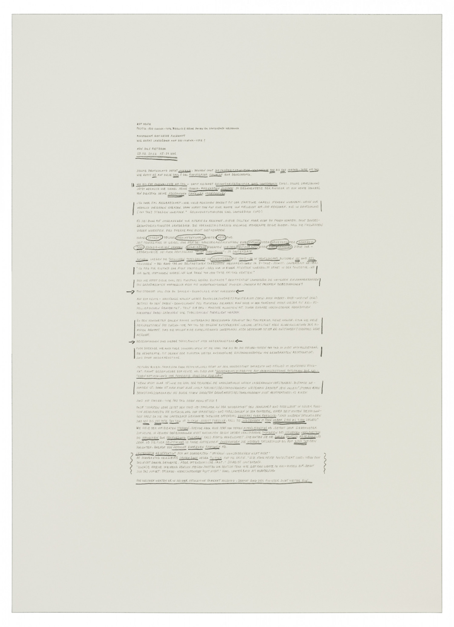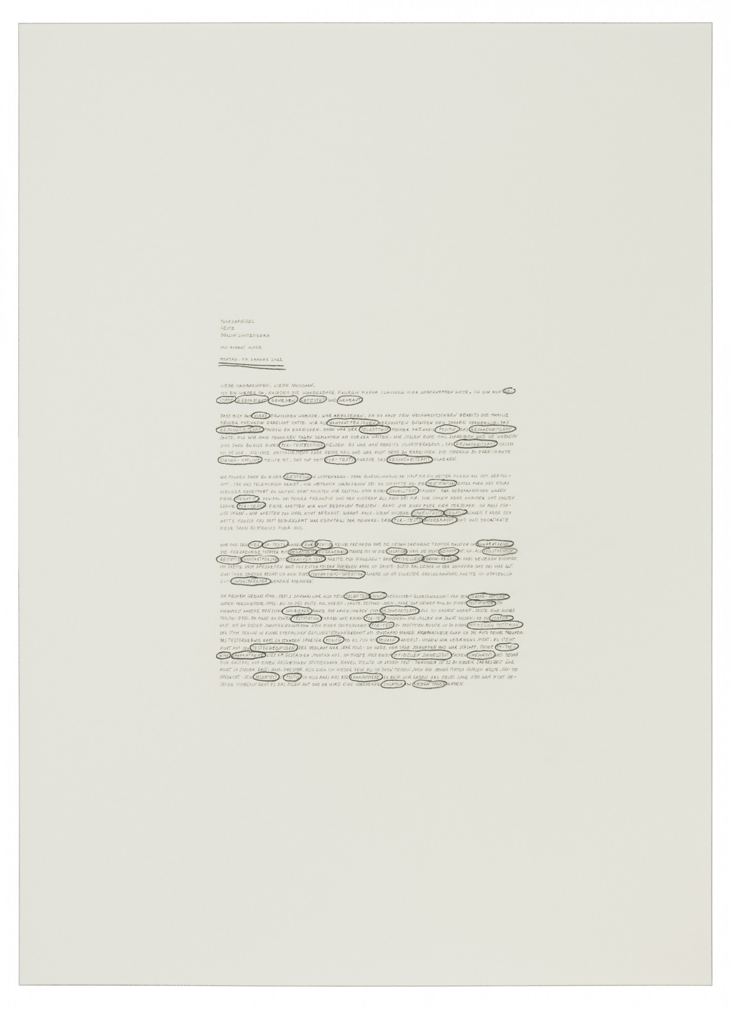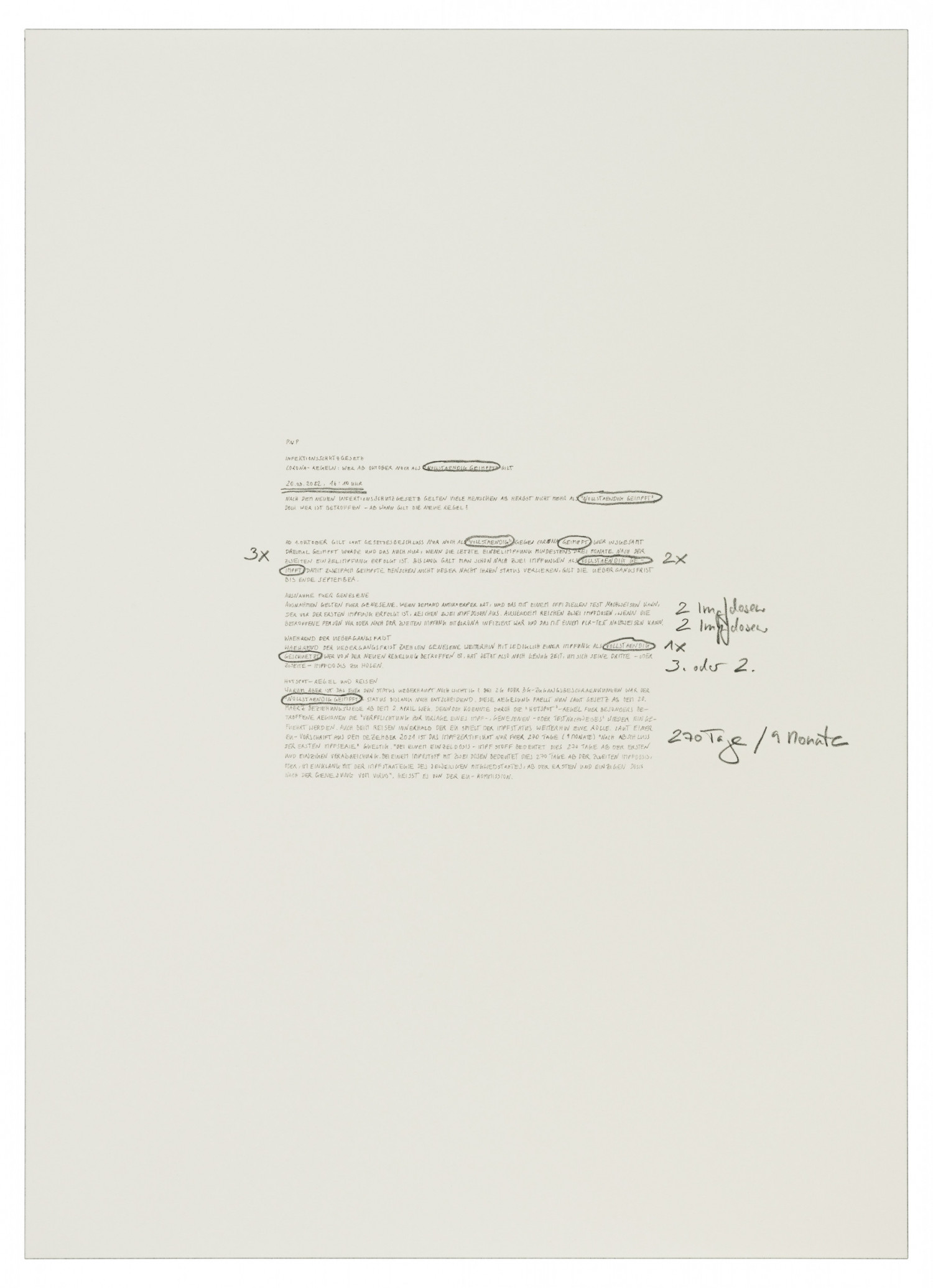 Ich sammle Zeitungsartikel, die online erscheinen, übertrage sie in Druckschrift mit Tusche in die Mitte des Zeichenblattes und bearbeite diese dann mit Bleistift. So setze ich zum Beispiel in Schreibschrift Kommentare ringsum, unterstreiche oder umkreise Passagen, hebe Wörter oder Sätze hervor oder wiederhole einzelne Worte aus den Artikeln.