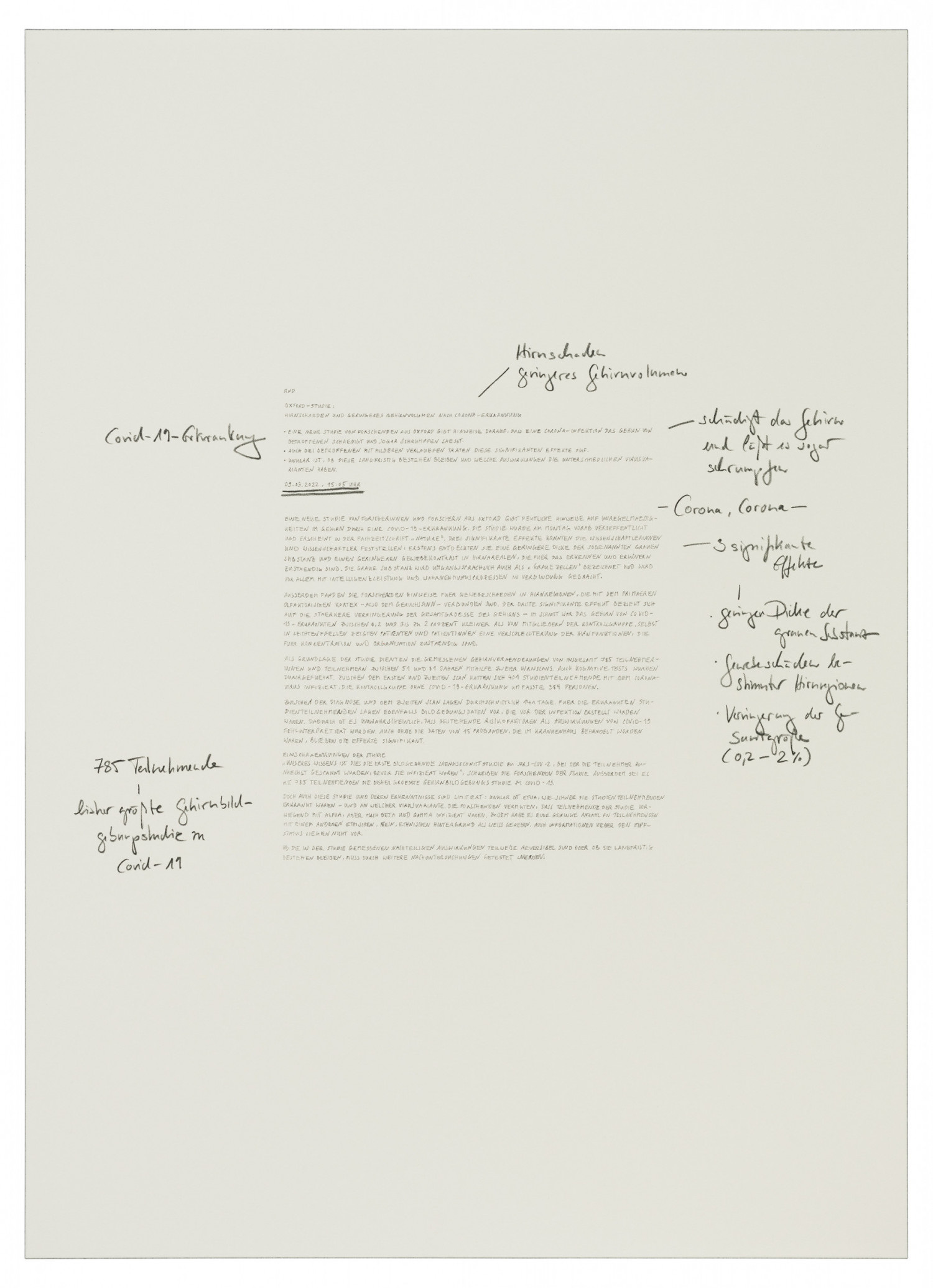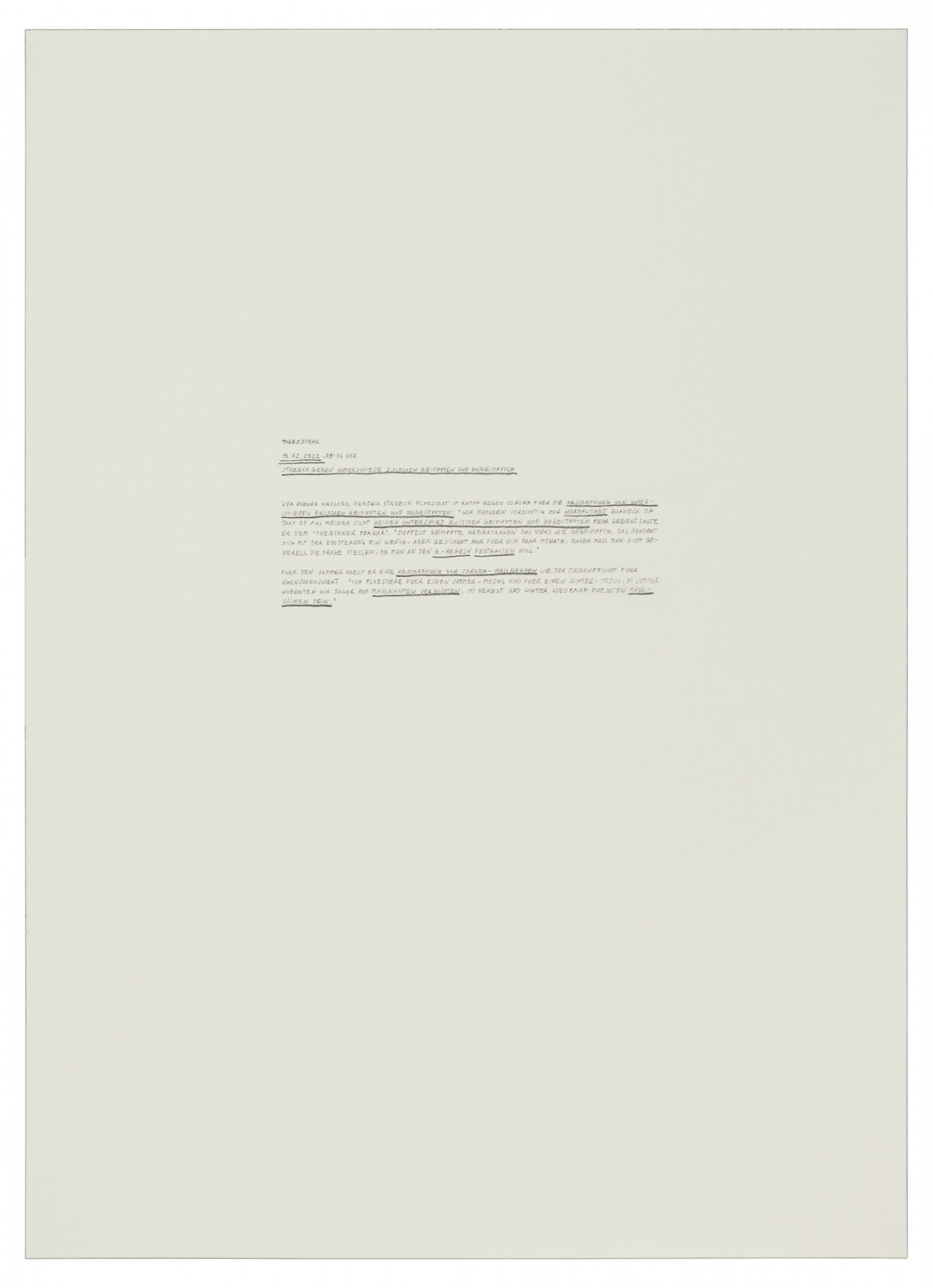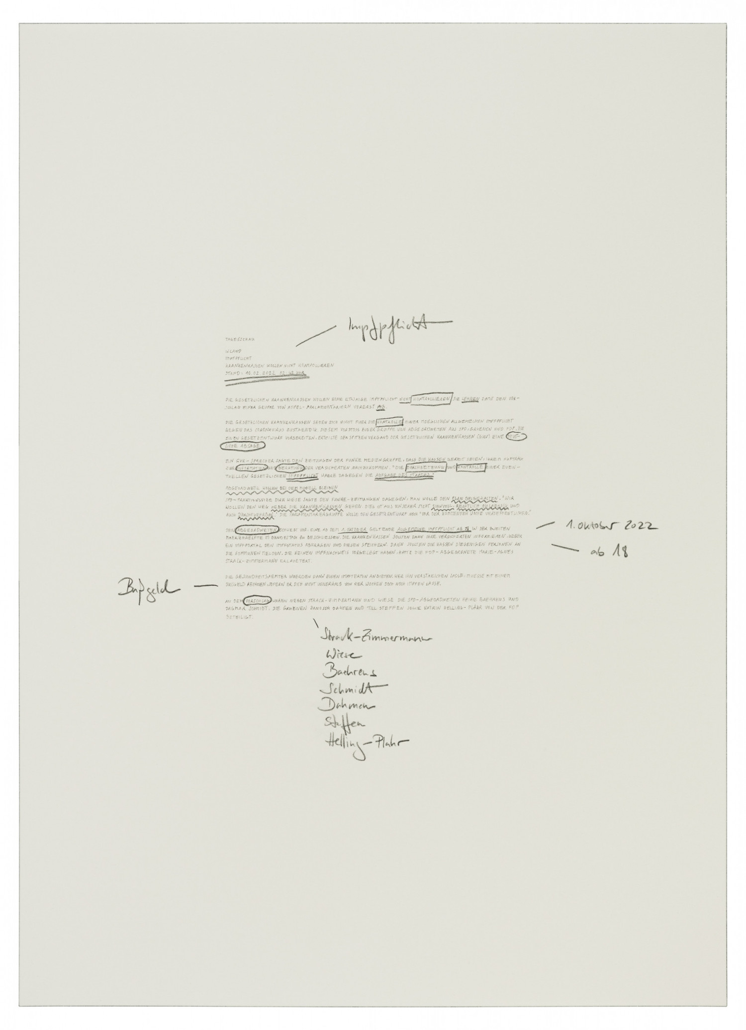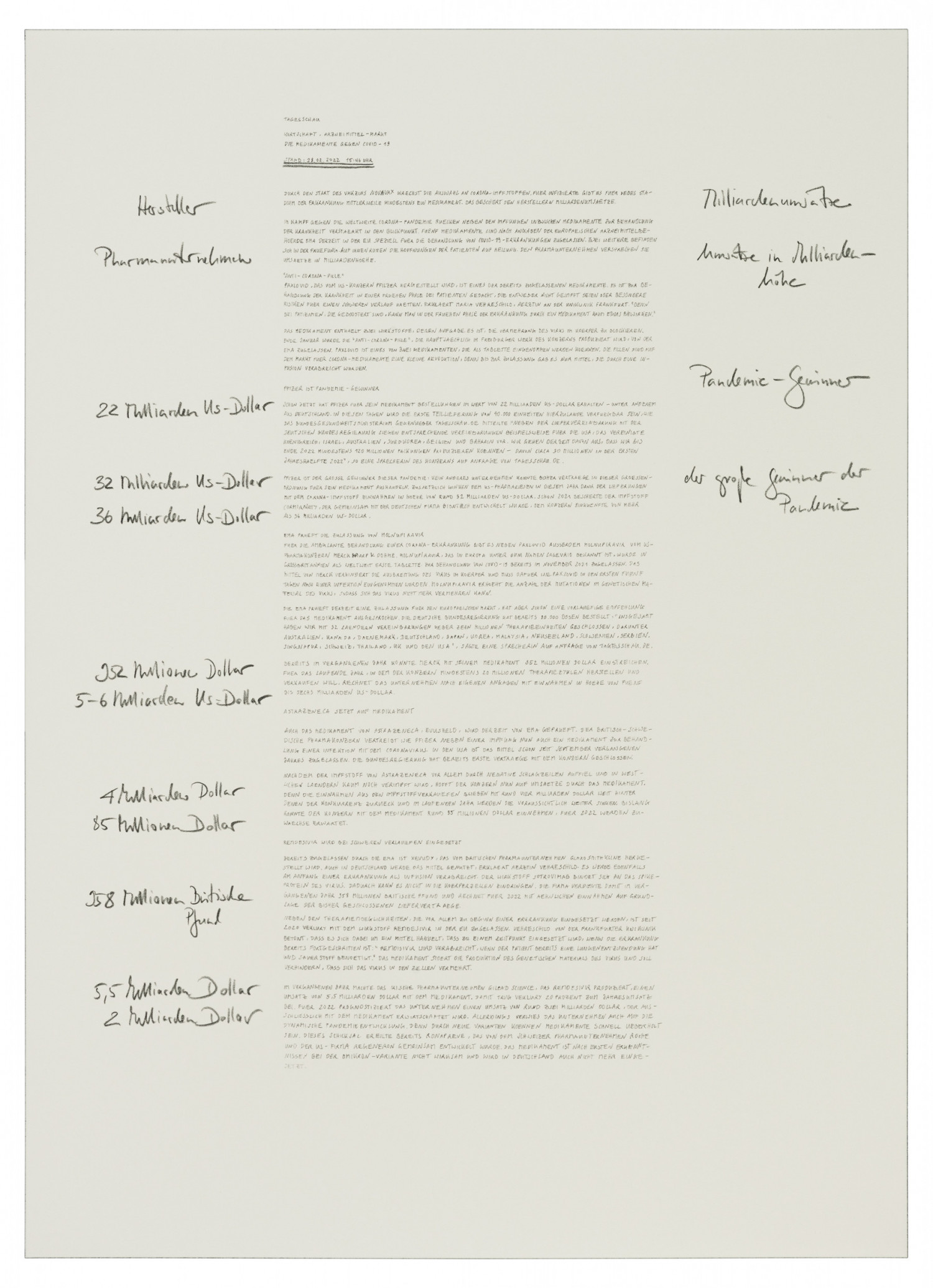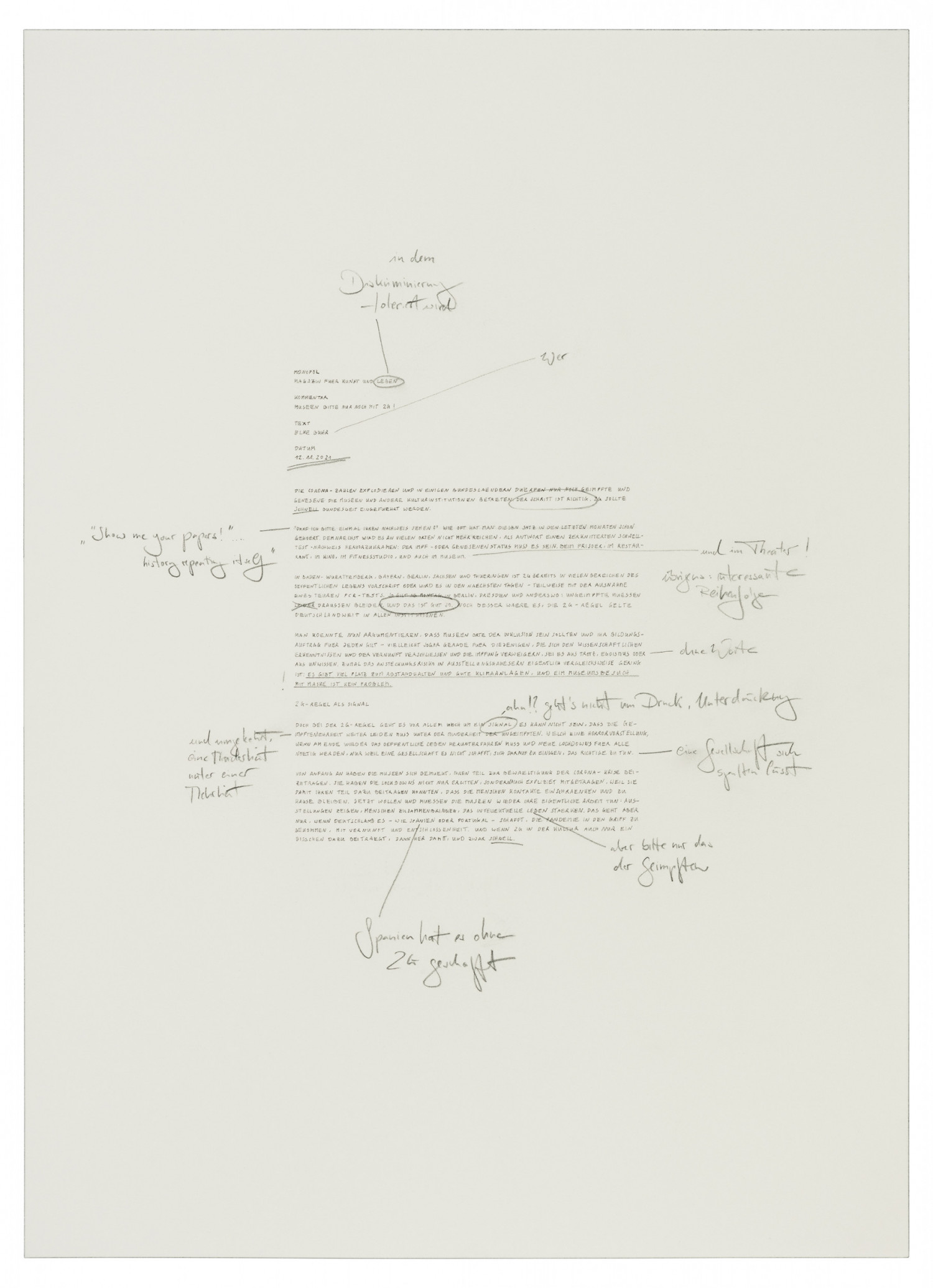Ich sammle Zeitungsartikel, die online erscheinen, übertrage sie in Druckschrift mit Tusche in die Mitte des Zeichenblattes und bearbeite diese dann mit Bleistift. So setze ich zum Beispiel in Schreibschrift Kommentare ringsum, unterstreiche oder umkreise Passagen, hebe Wörter oder Sätze hervor oder wiederhole einzelne Worte aus den Artikeln.