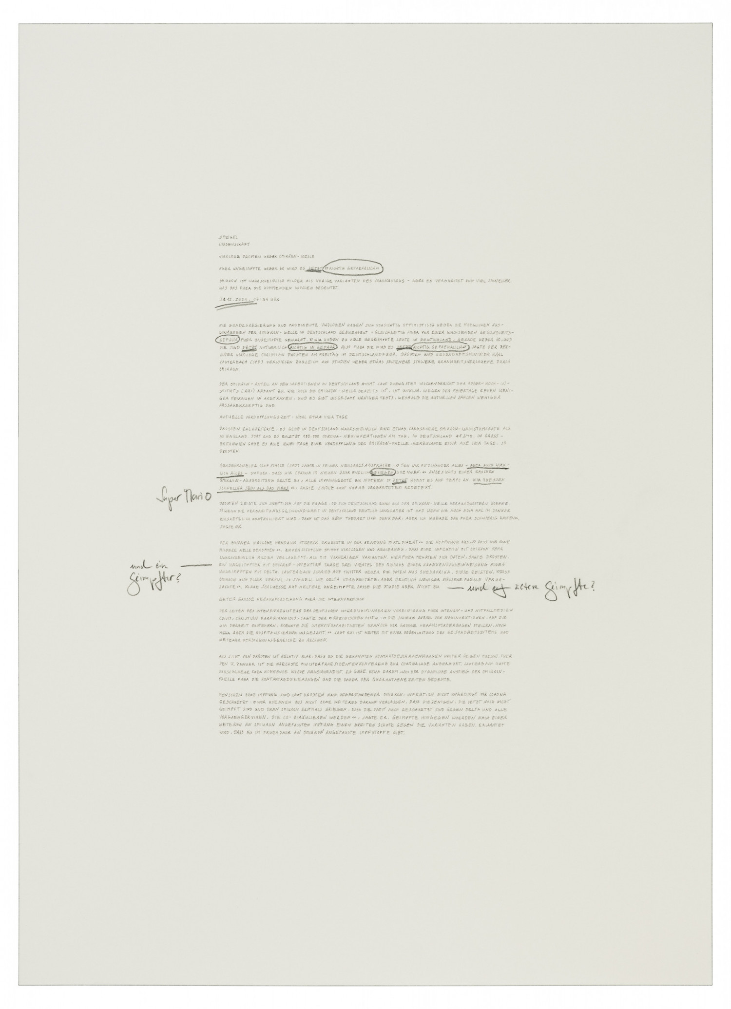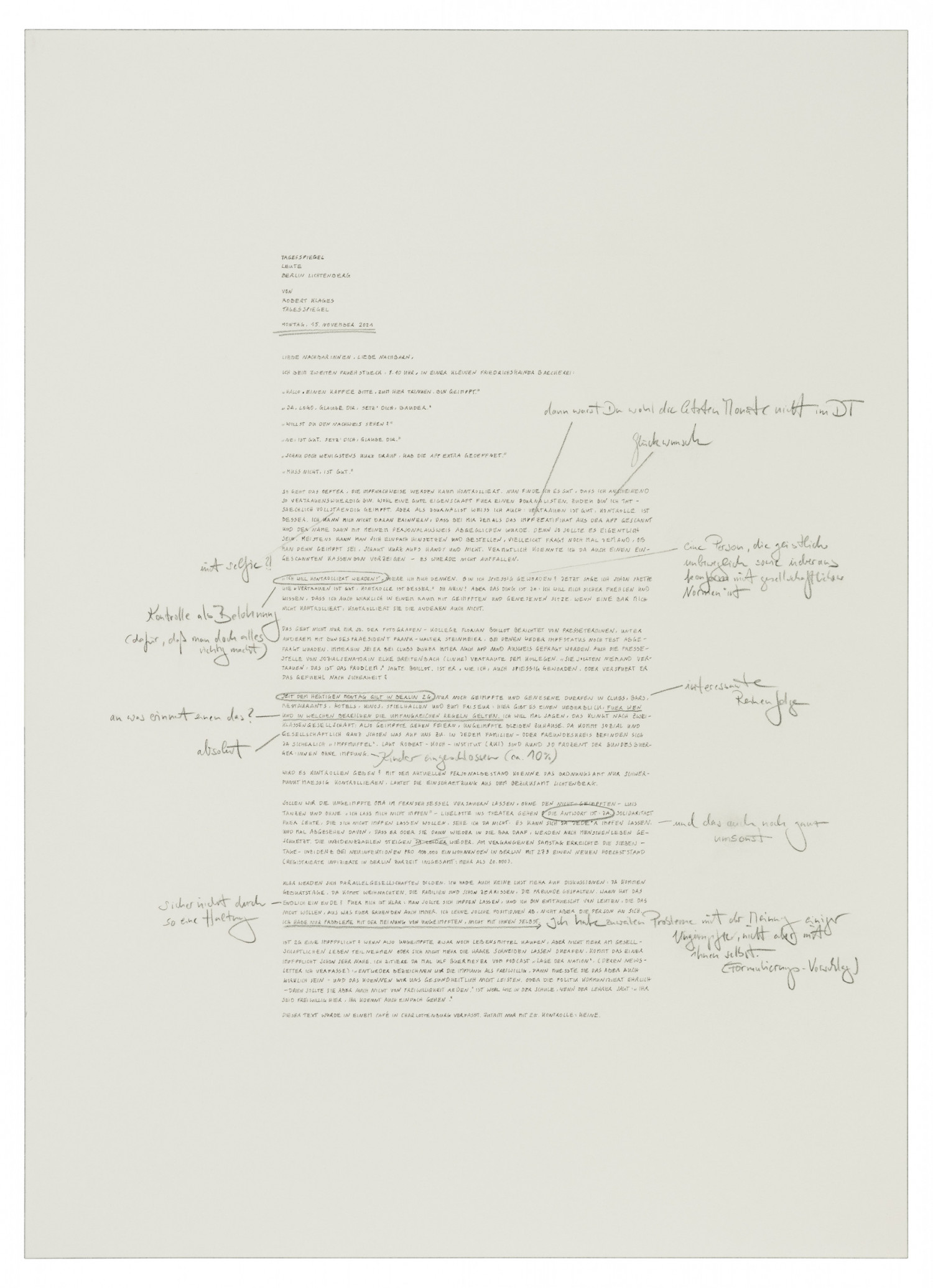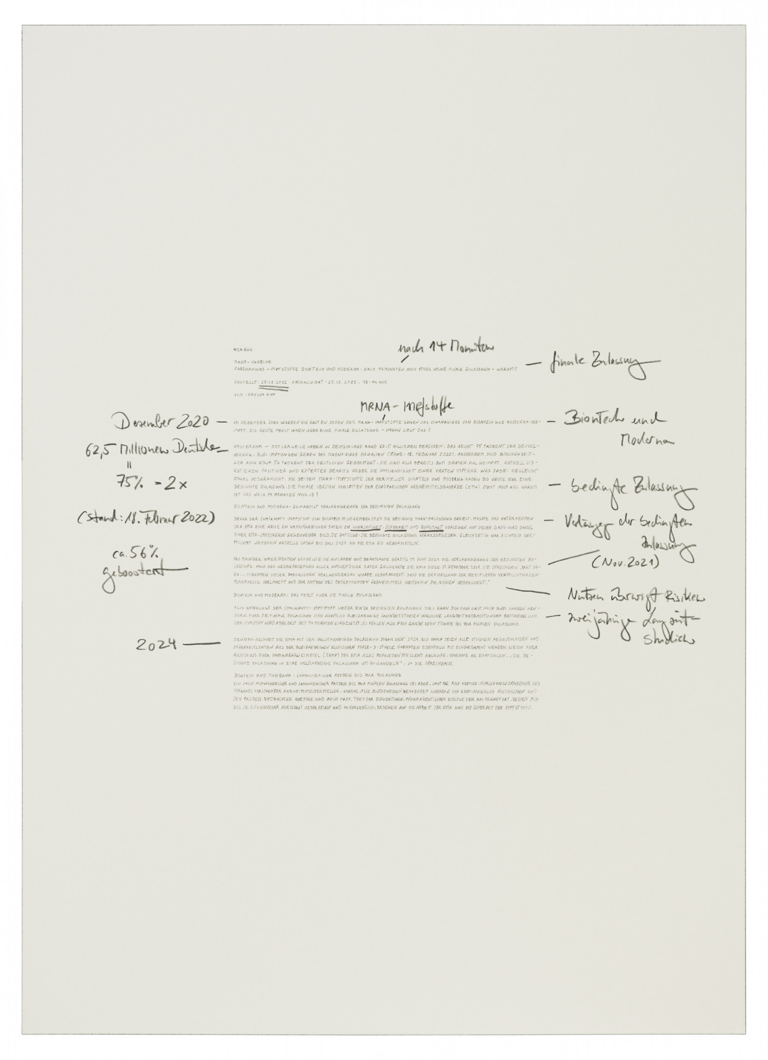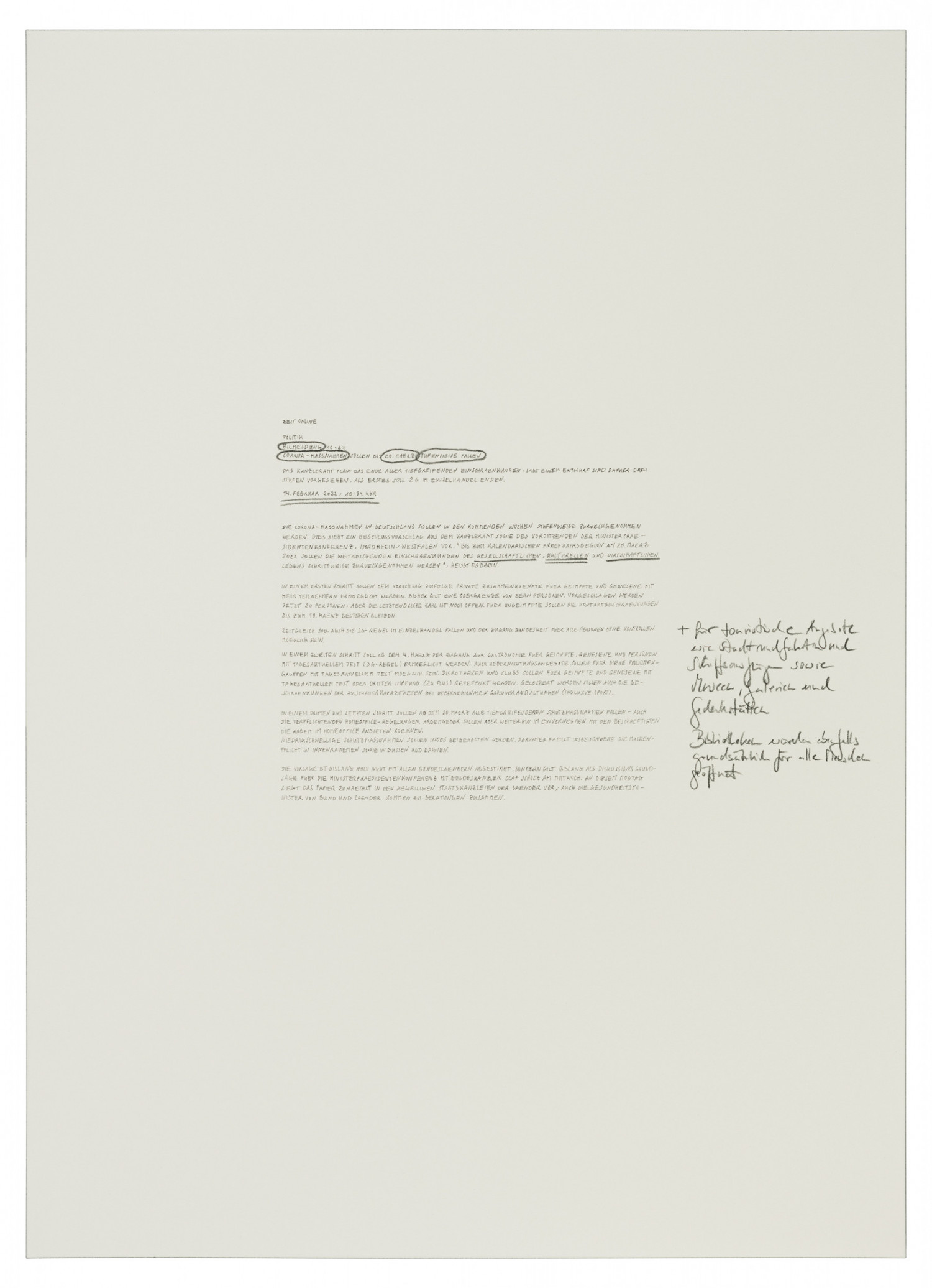 Ich sammle Zeitungsartikel, die online erscheinen, übertrage sie in Druckschrift mit Tusche in die Mitte des Zeichenblattes und bearbeite diese dann mit Bleistift. So setze ich zum Beispiel in Schreibschrift Kommentare ringsum, unterstreiche oder umkreise Passagen, hebe Wörter oder Sätze hervor oder wiederhole einzelne Worte aus den Artikeln.