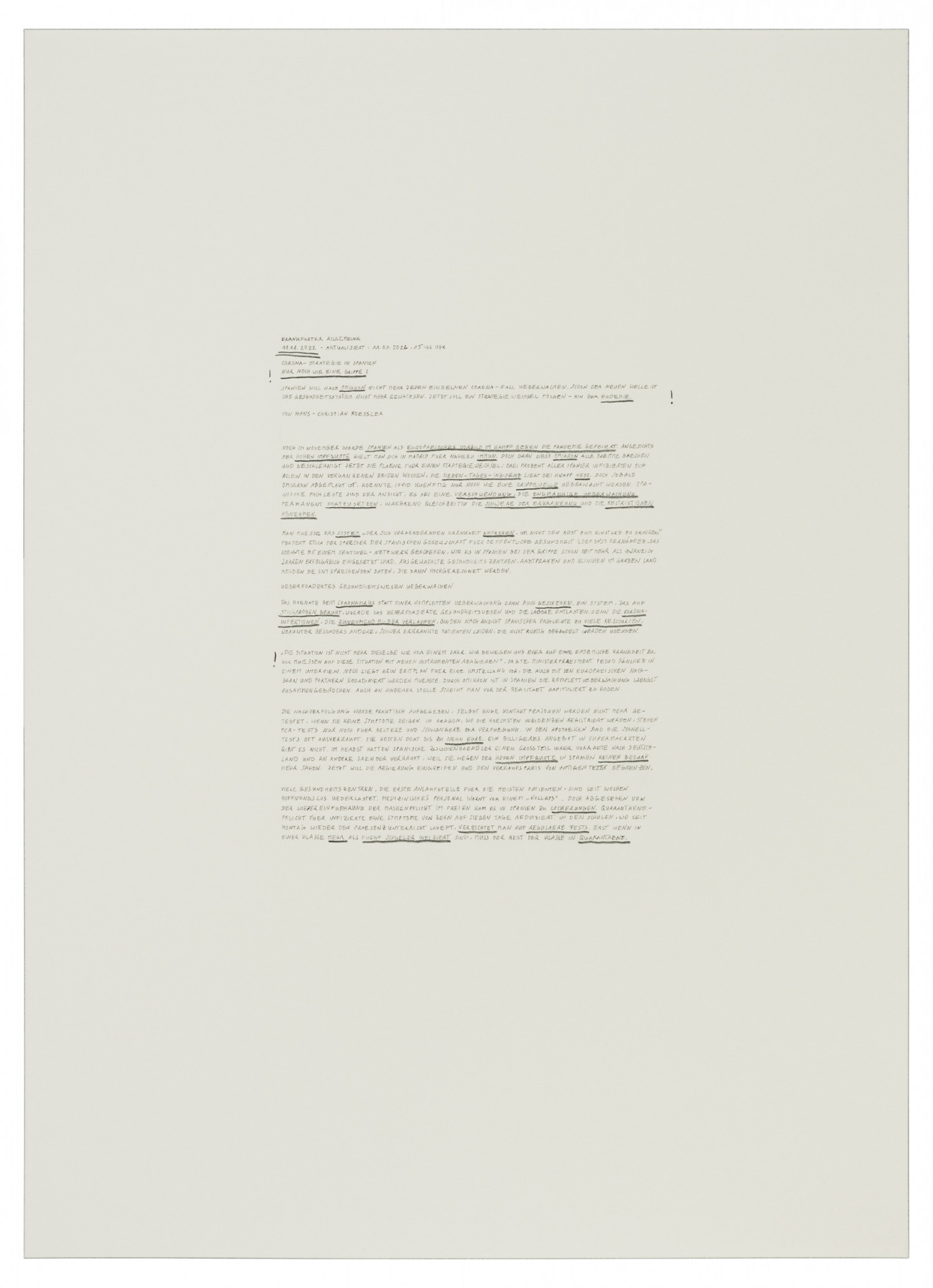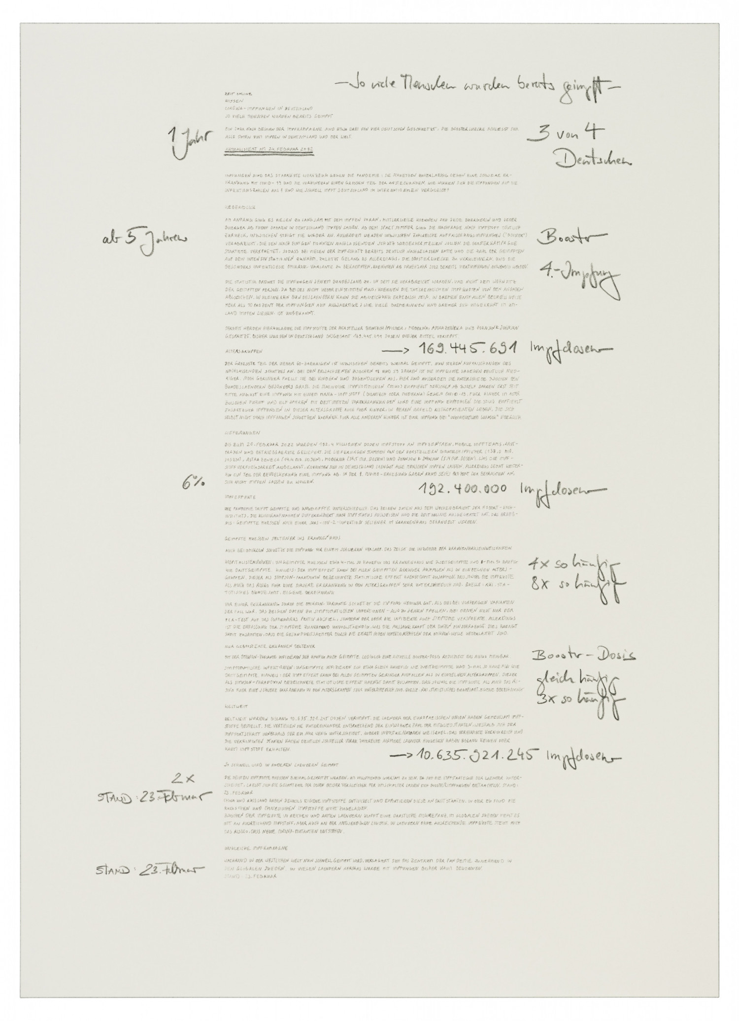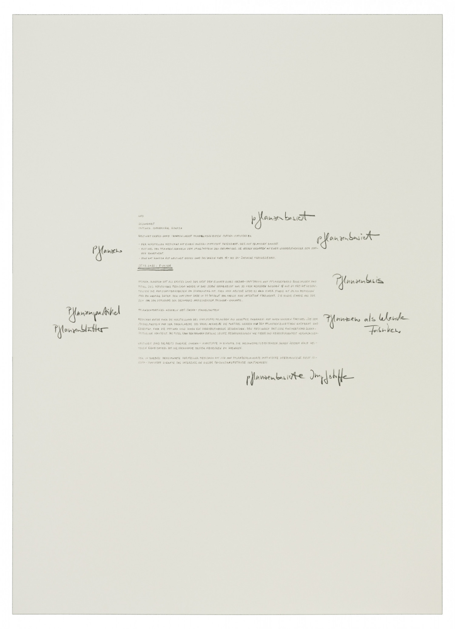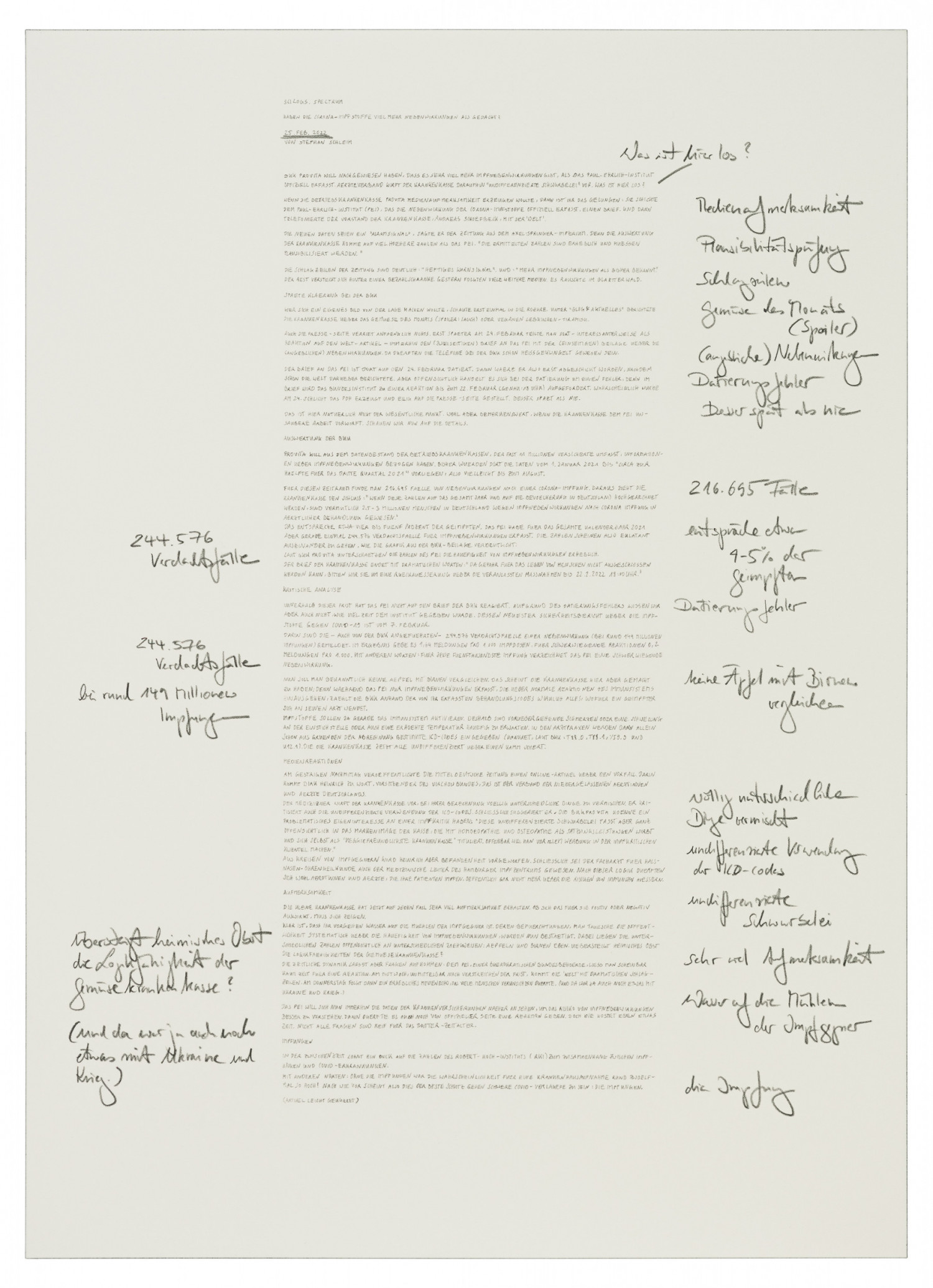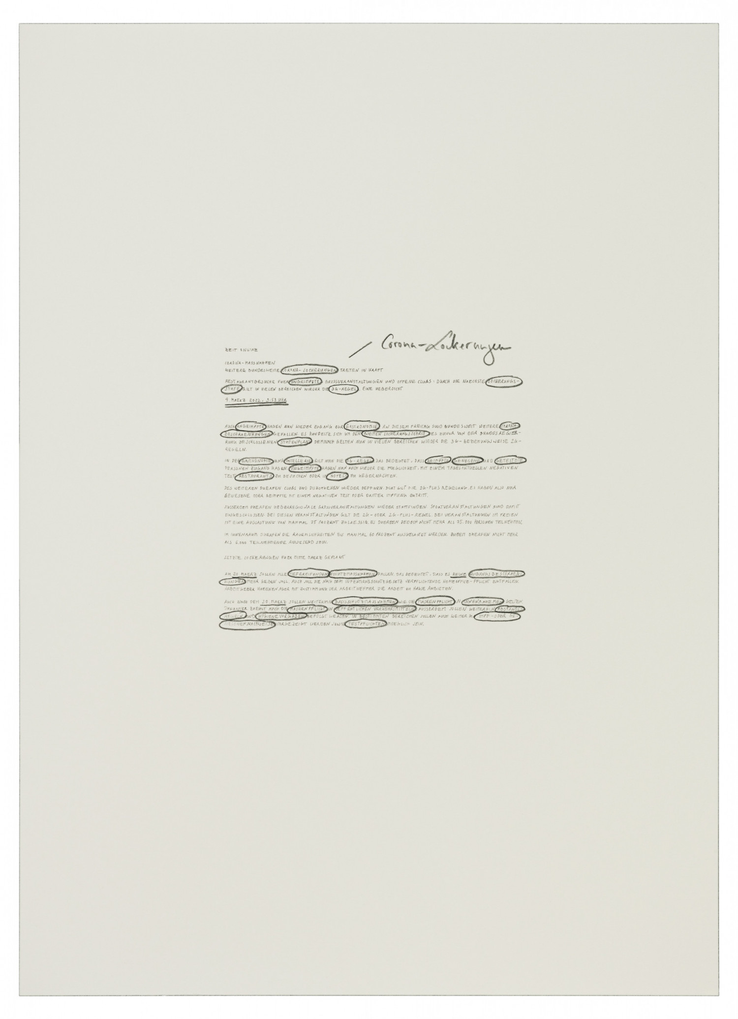 Ich sammle Zeitungsartikel, die online erscheinen, übertrage sie in Druckschrift mit Tusche in die Mitte des Zeichenblattes und bearbeite diese dann mit Bleistift. So setze ich zum Beispiel in Schreibschrift Kommentare ringsum, unterstreiche oder umkreise Passagen, hebe Wörter oder Sätze hervor oder wiederhole einzelne Worte aus den Artikeln.
