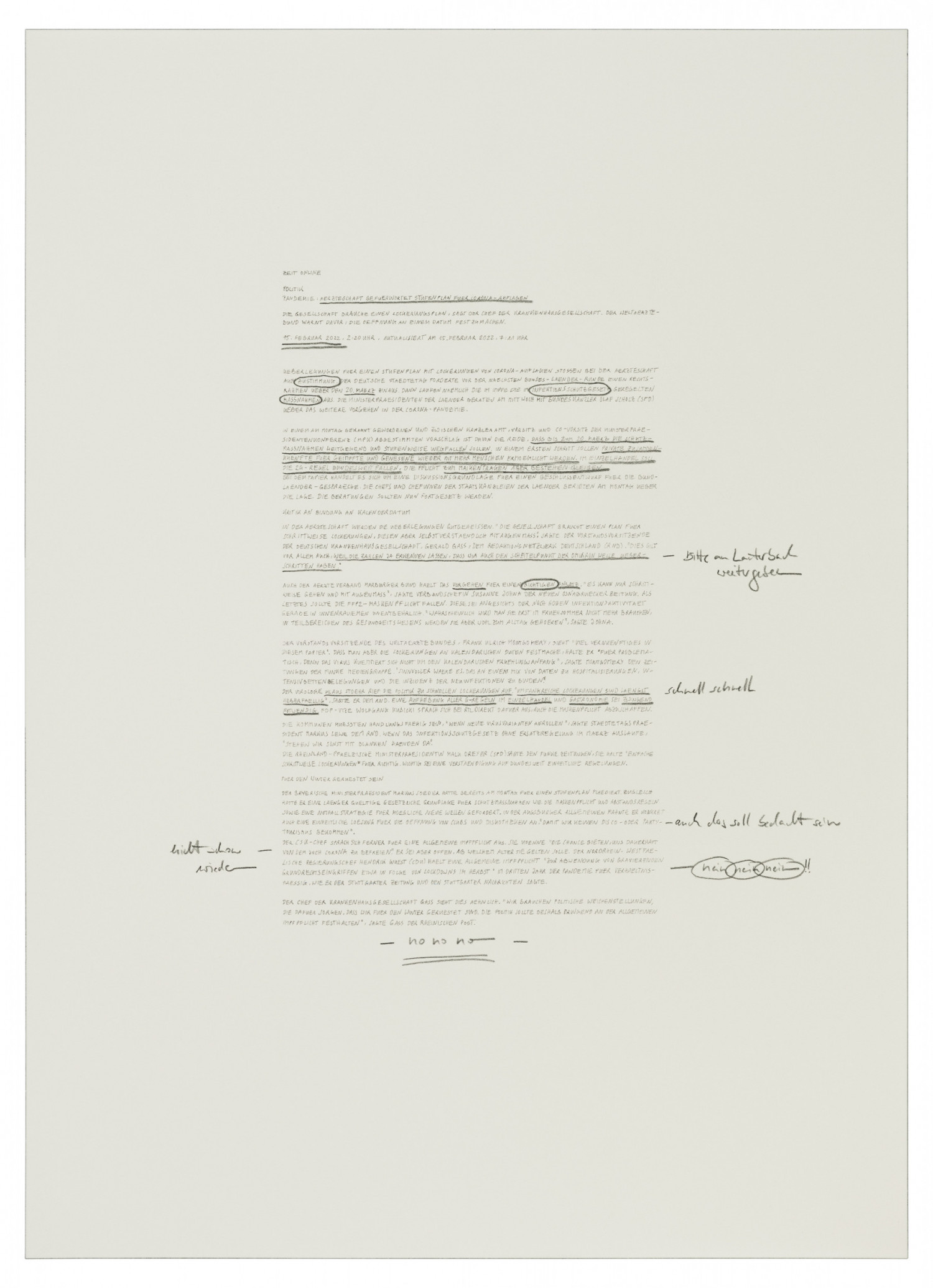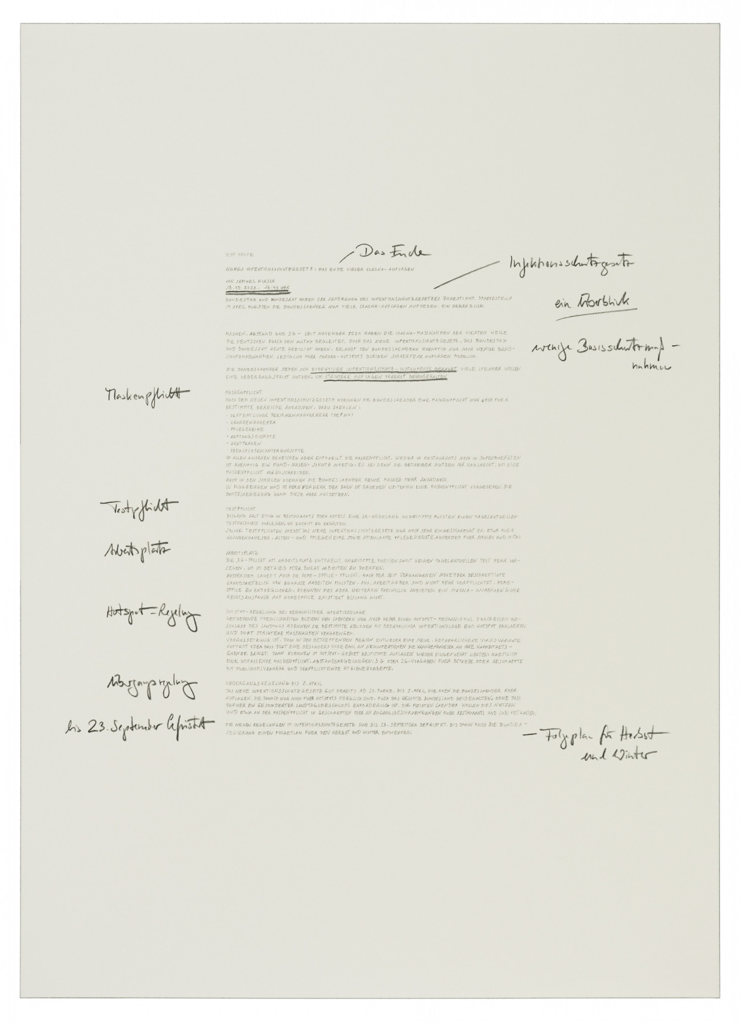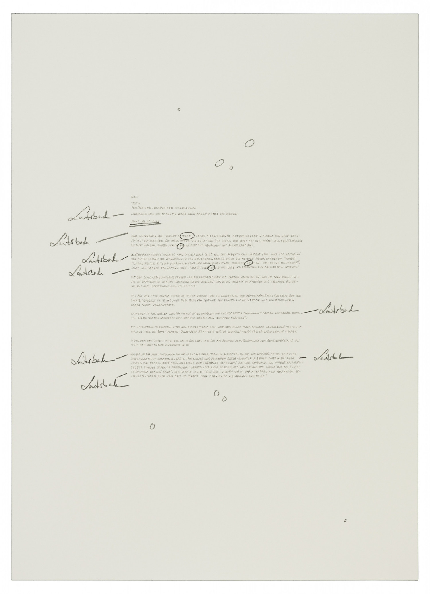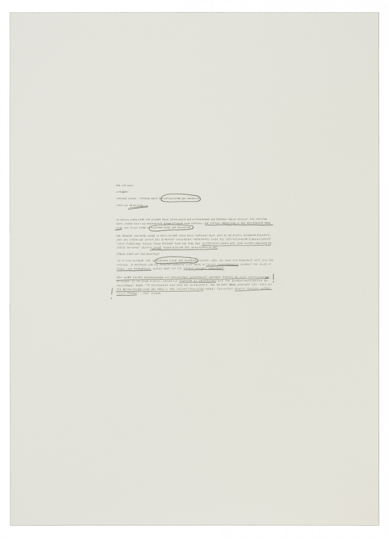 Ich sammle Zeitungsartikel, die online erscheinen, übertrage sie in Druckschrift mit Tusche in die Mitte des Zeichenblattes und bearbeite diese dann mit Bleistift. So setze ich zum Beispiel in Schreibschrift Kommentare ringsum, unterstreiche oder umkreise Passagen, hebe Wörter oder Sätze hervor oder wiederhole einzelne Worte aus den Artikeln.