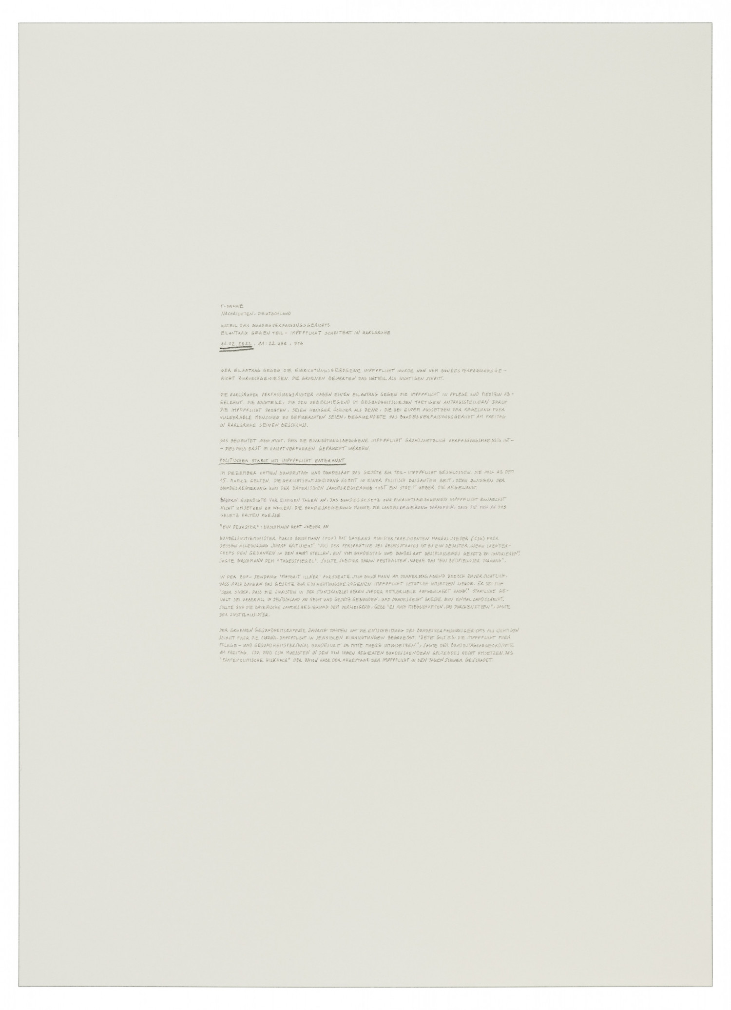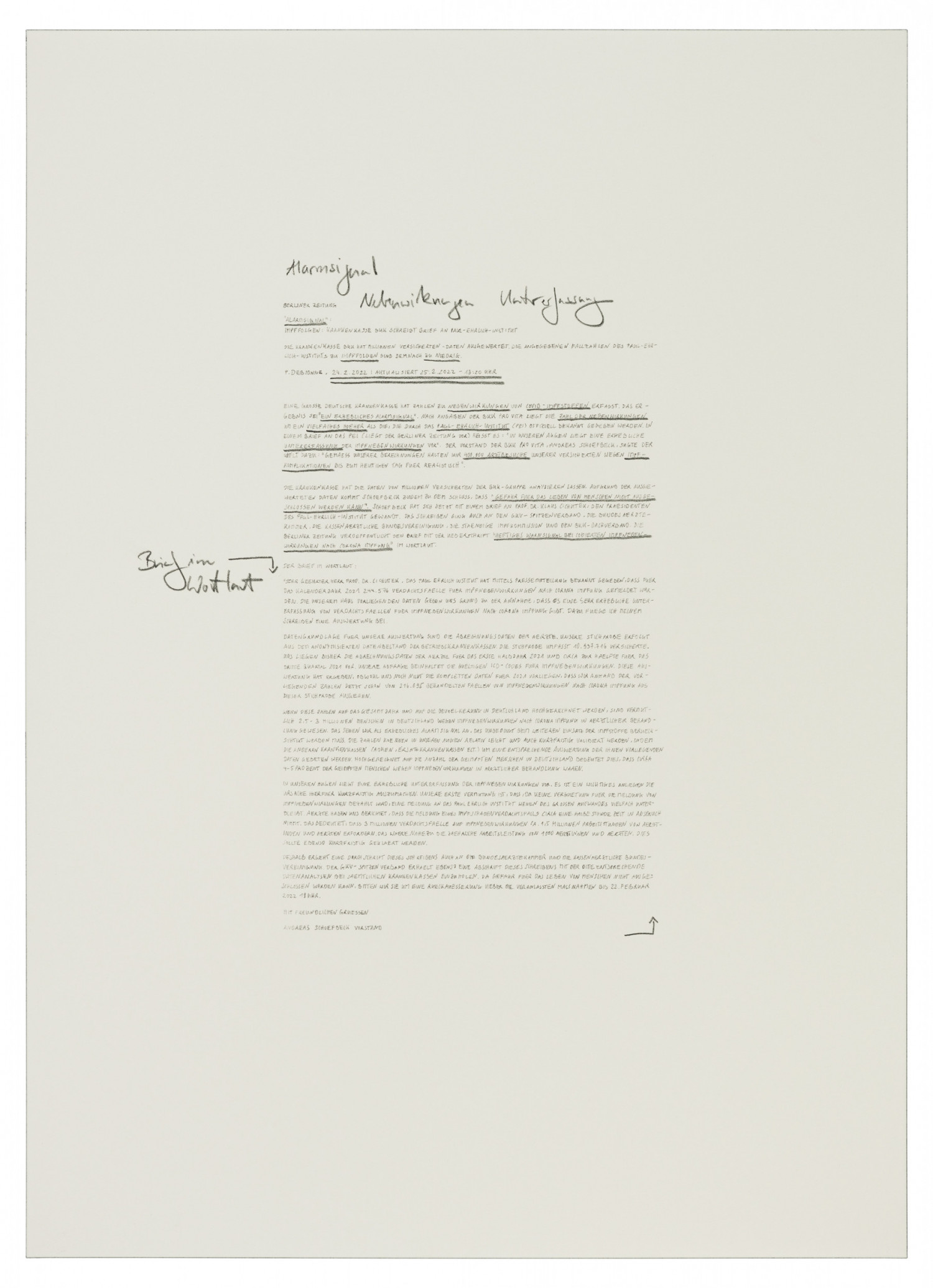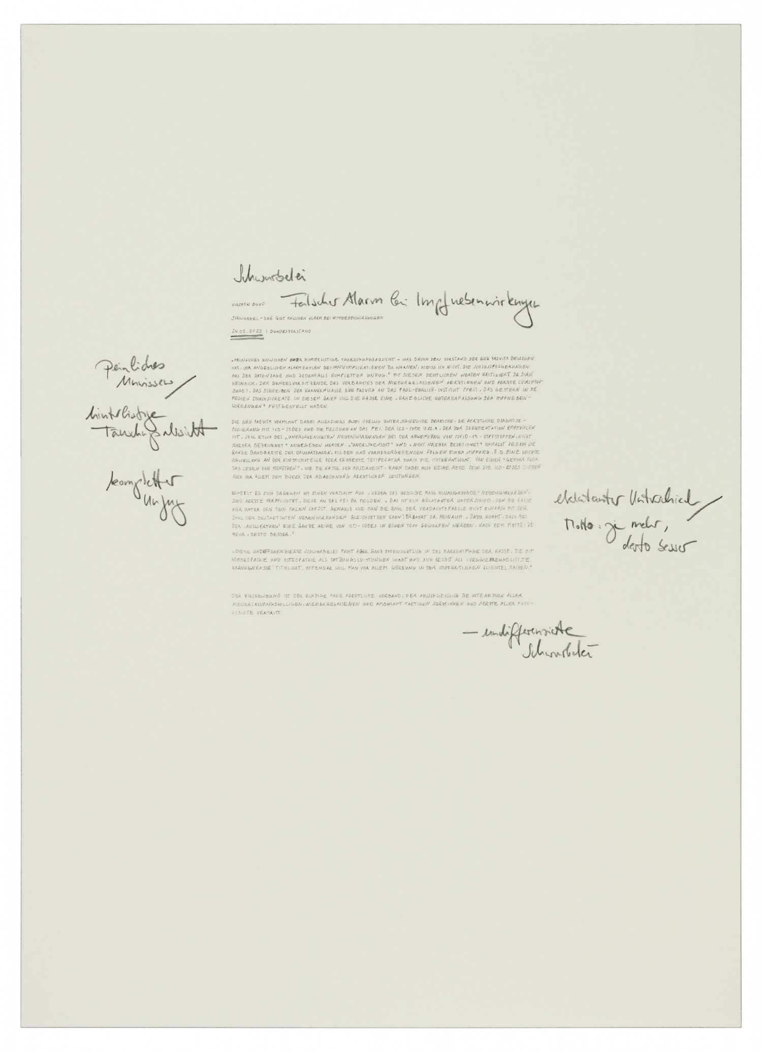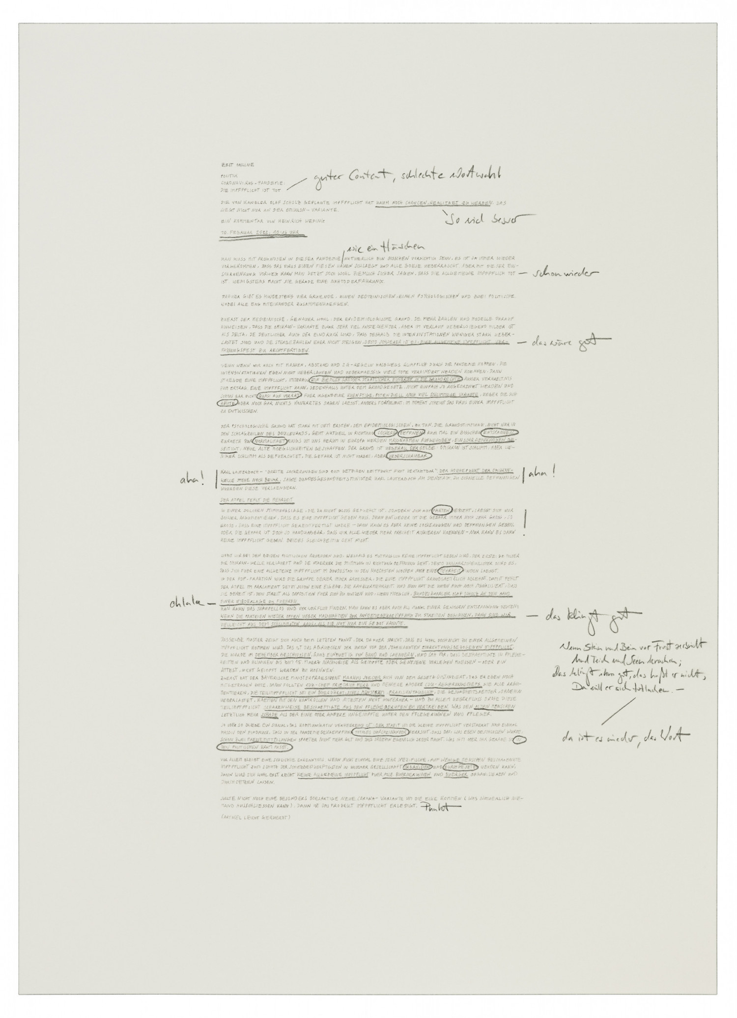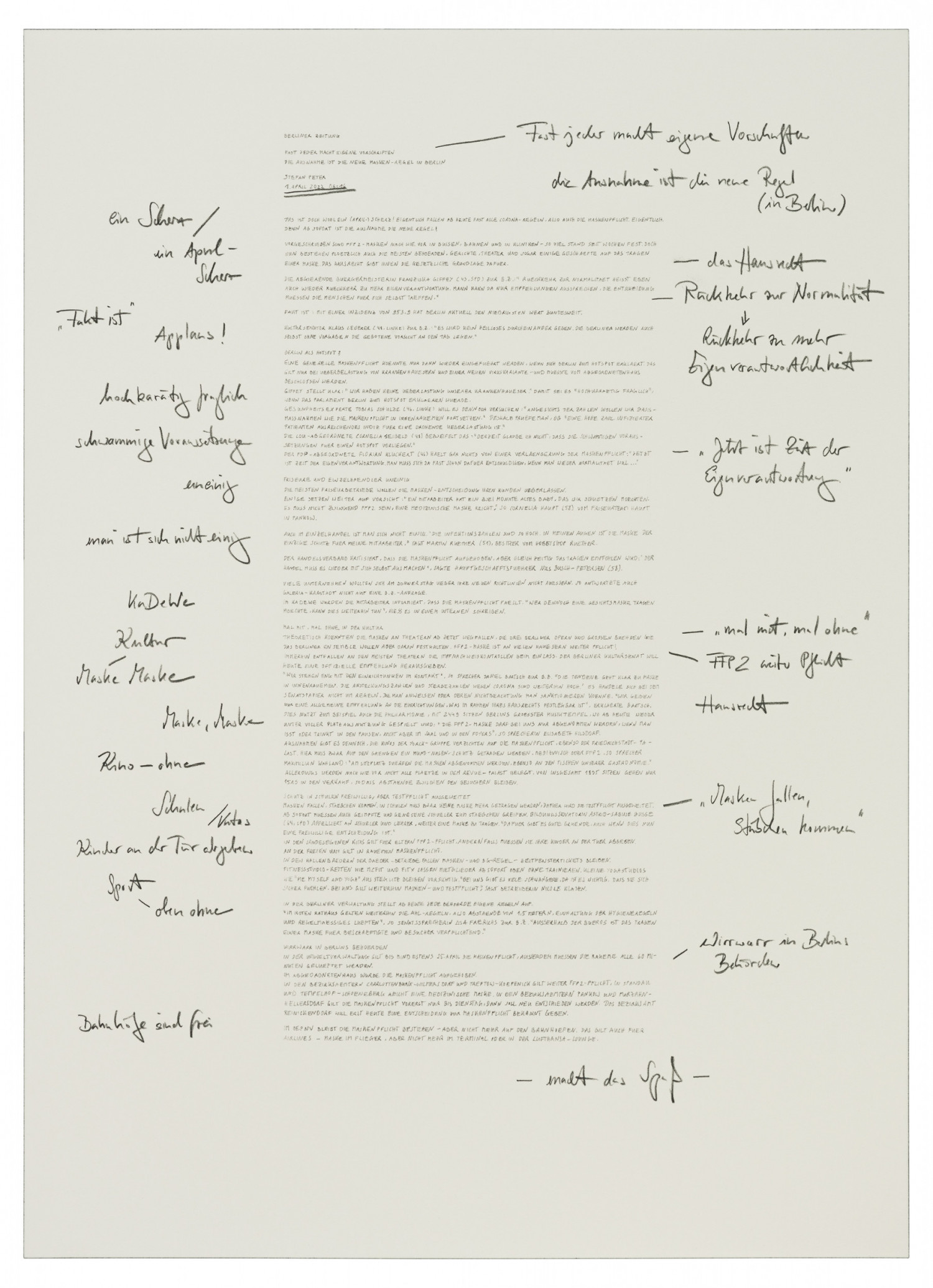 Ich sammle Zeitungsartikel, die online erscheinen, übertrage sie in Druckschrift mit Tusche in die Mitte des Zeichenblattes und bearbeite diese dann mit Bleistift. So setze ich zum Beispiel in Schreibschrift Kommentare ringsum, unterstreiche oder umkreise Passagen, hebe Wörter oder Sätze hervor oder wiederhole einzelne Worte aus den Artikeln.