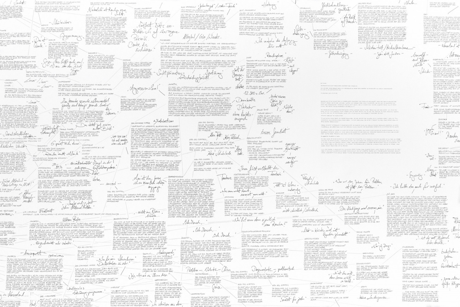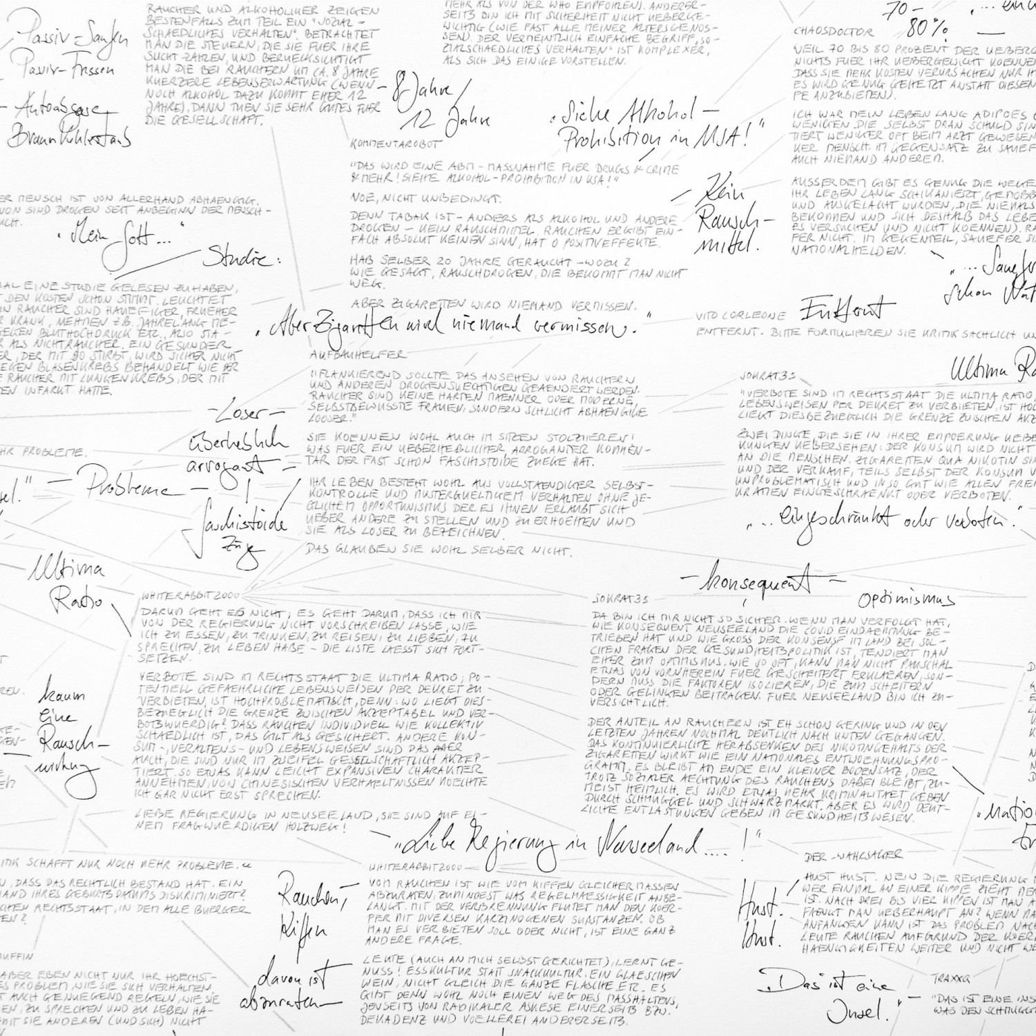 This drawing is a continuation of the billboard work “Glooming Lights“, which is about a law in New Zealand which banned young people from ever smoking. The size of the drawing paper used allows me to quote the entire article and a very large number of reader comments. As a final, newly added part of the work, I link the individual comments with the source to which they refer. This creates a complex communication network of sender, addressee and artist.