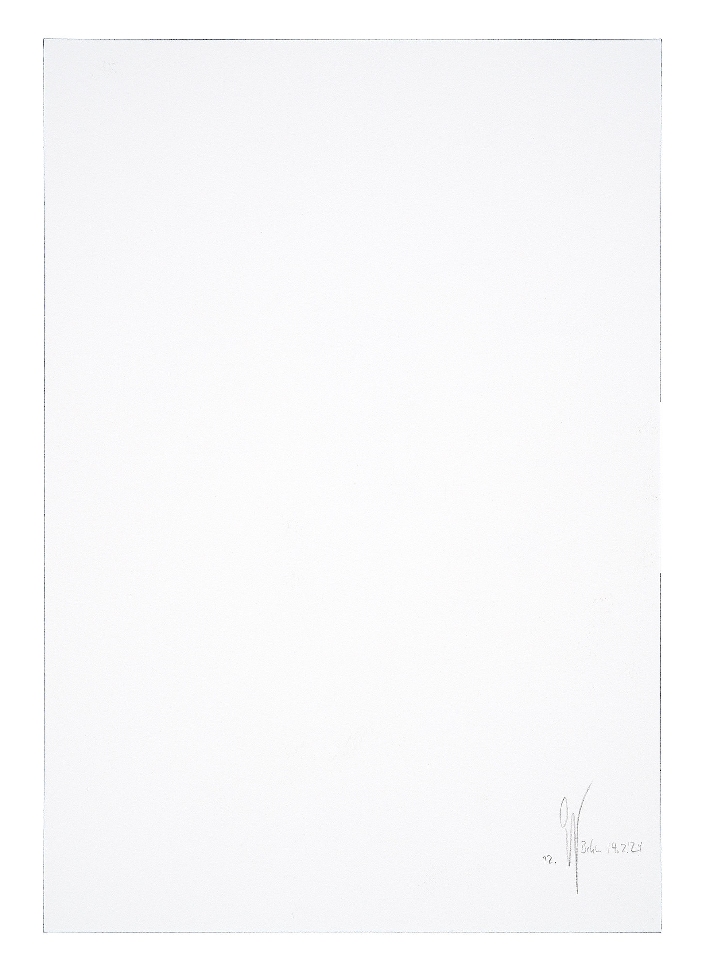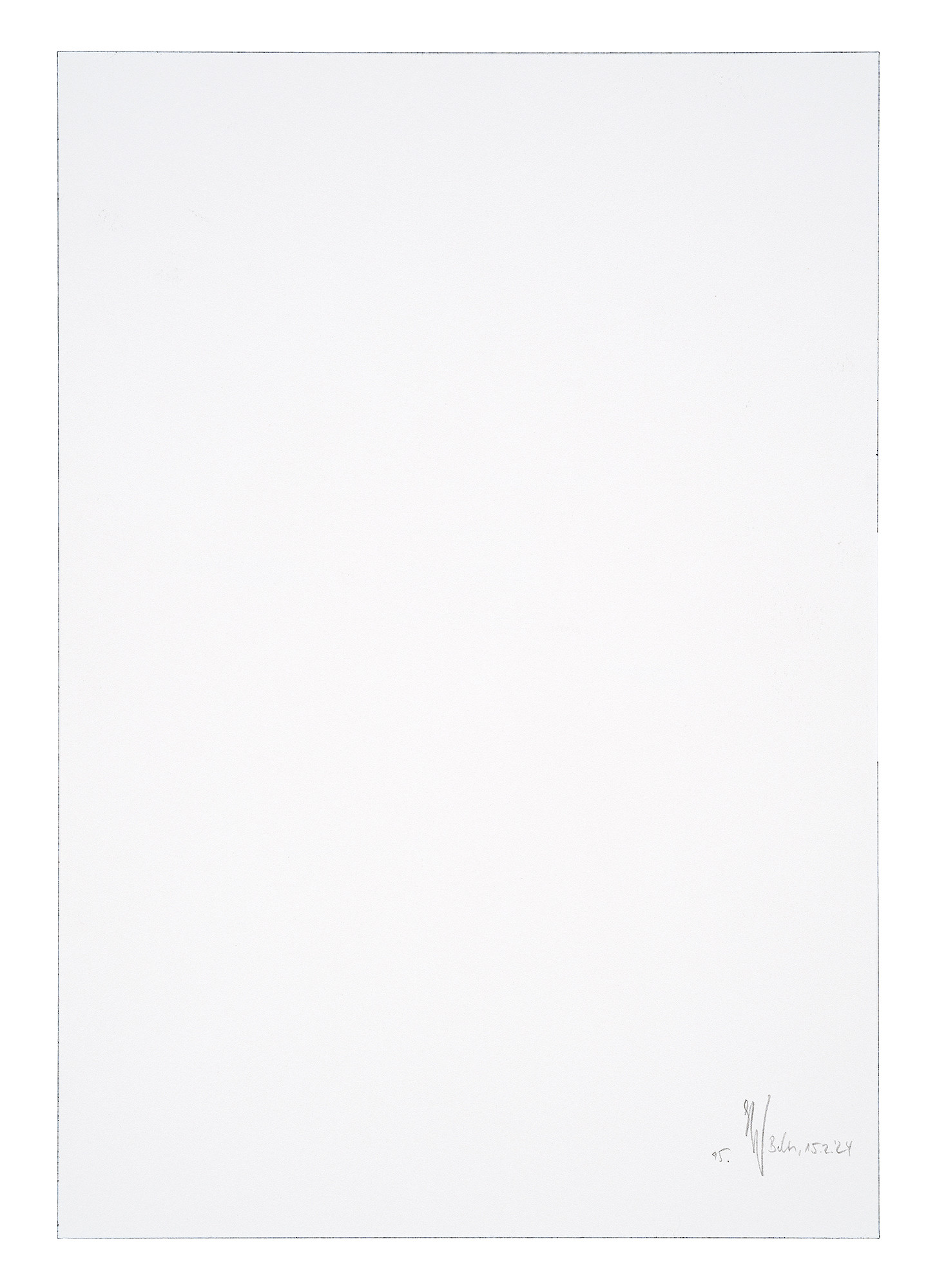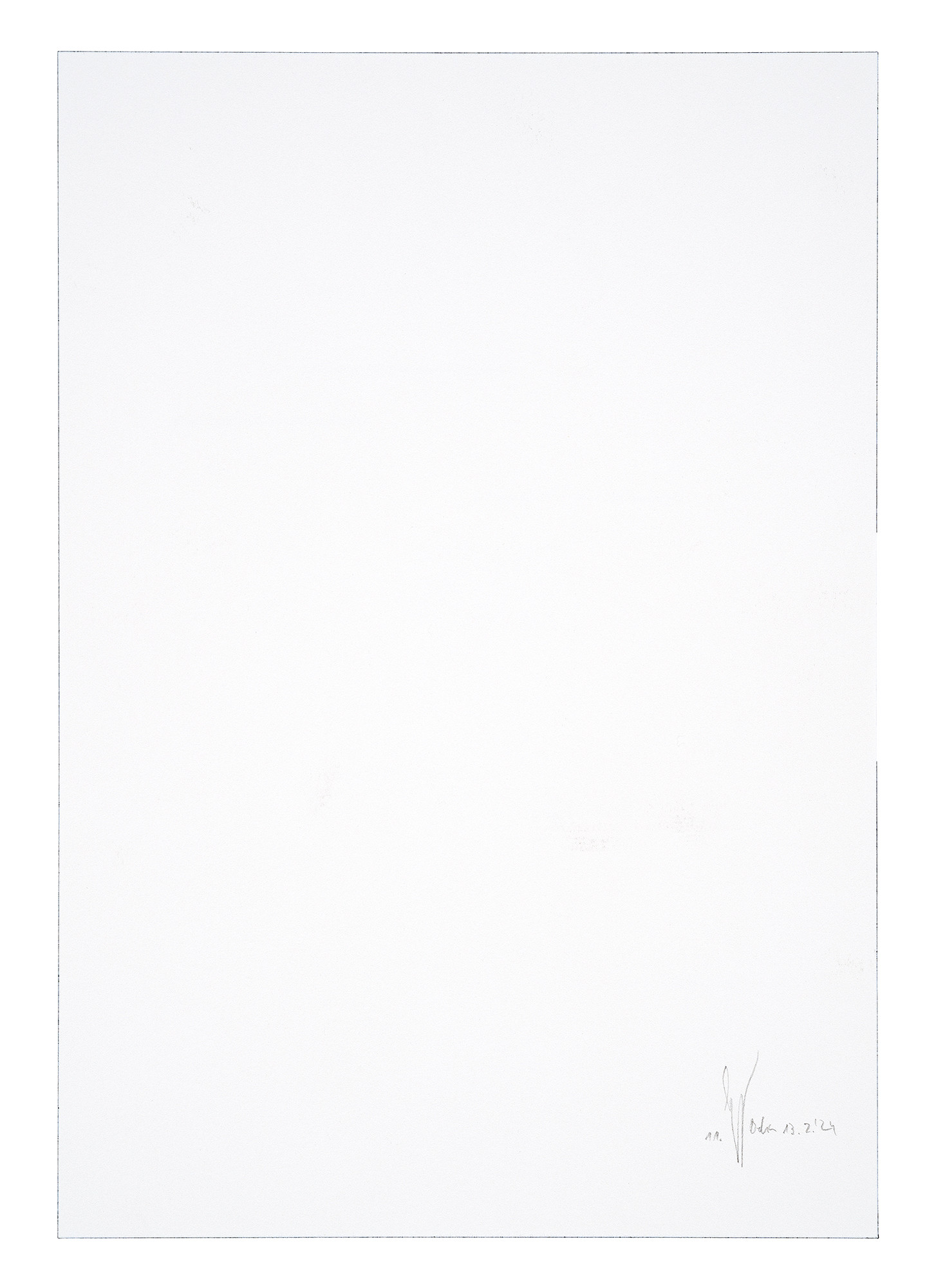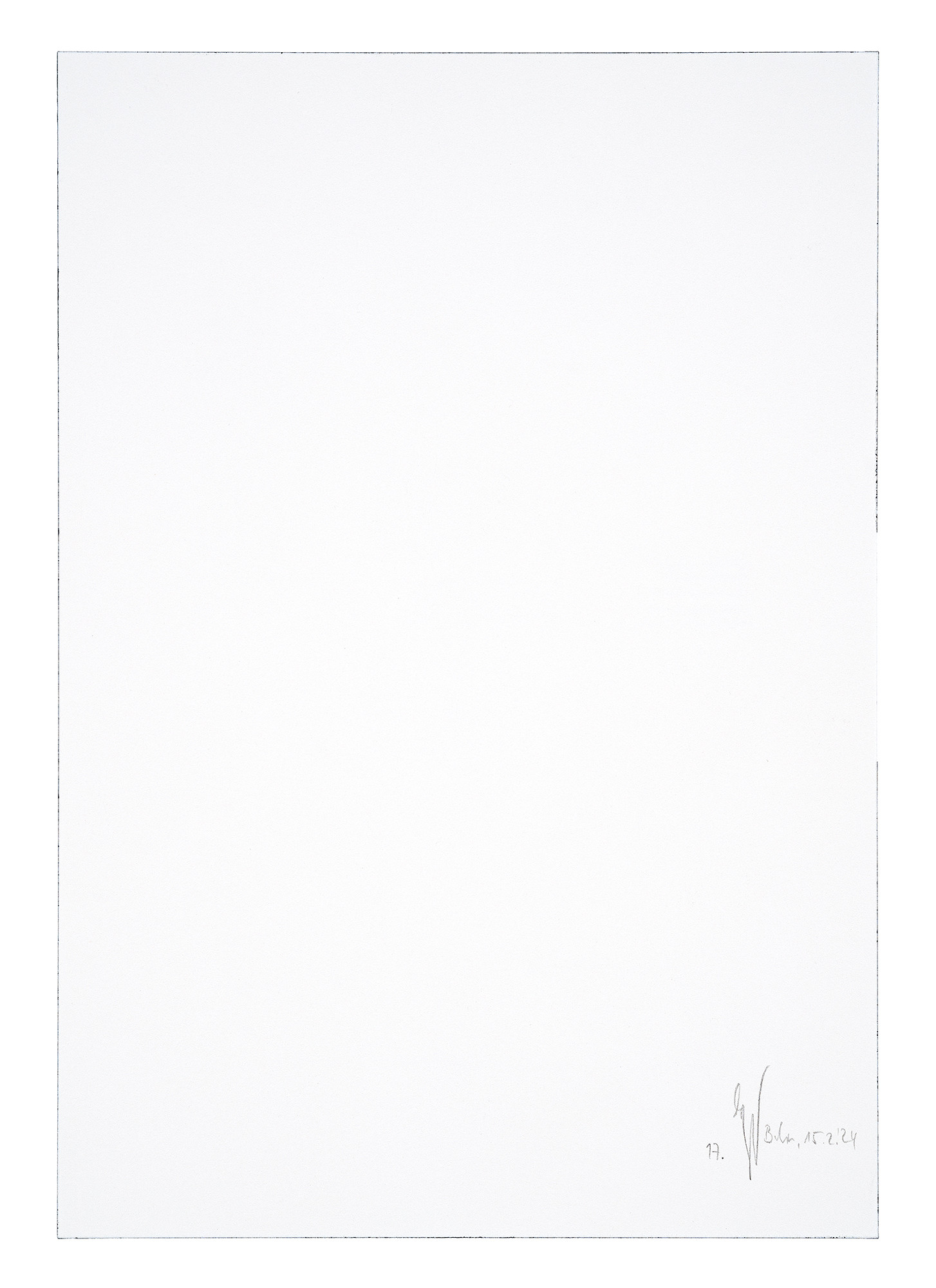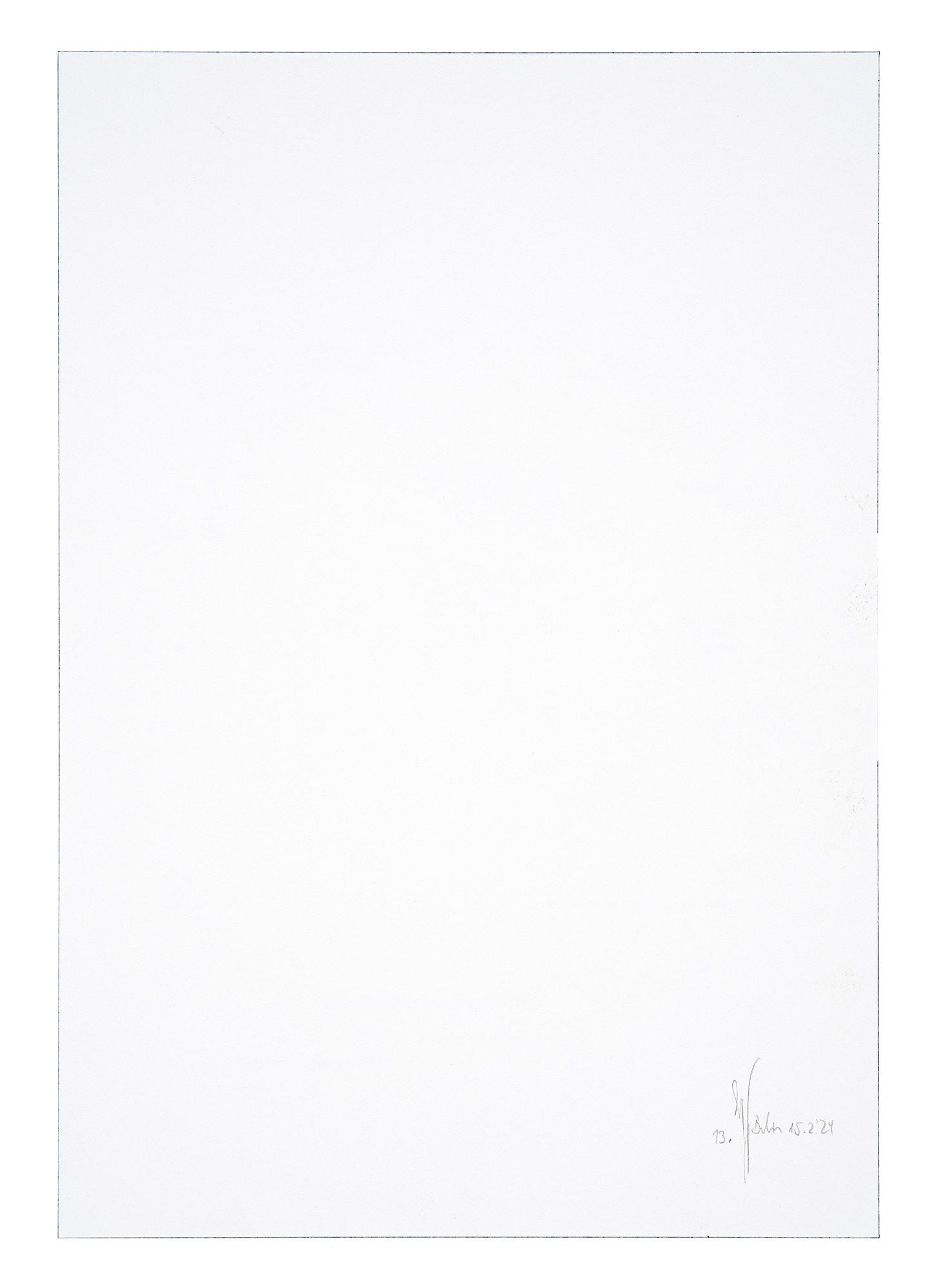 This work is an homage to the wonders and sorrows of interpersonal encounters. Again, different scales and styles of writing flow into one another, symbolising, among other things, the two characters in the story. Based on a communication between two people, which is written in fragments in 0,039 inch high, fine ink lettering in the centre of the sheet, their story as lovers is told over the course of the series. Further quotations surround this text, written in pencil. The man’s quotes are in block letters, the woman’s in cursive. Some of them are linked together. For the most part, the man’s texts are crossed out, which adds a profundity to the work. Injury versus self-injury, emotional autonomy versus devotion.