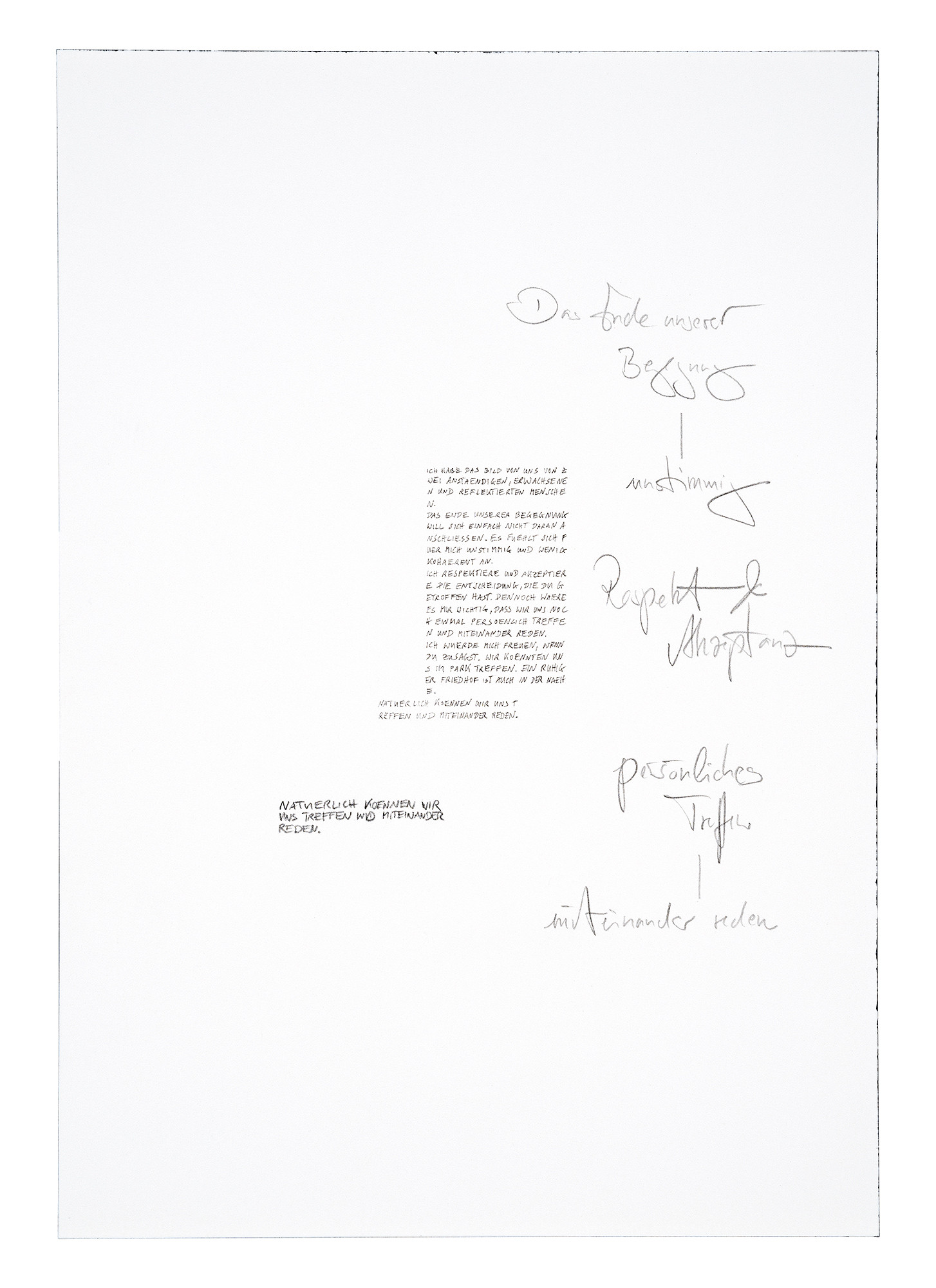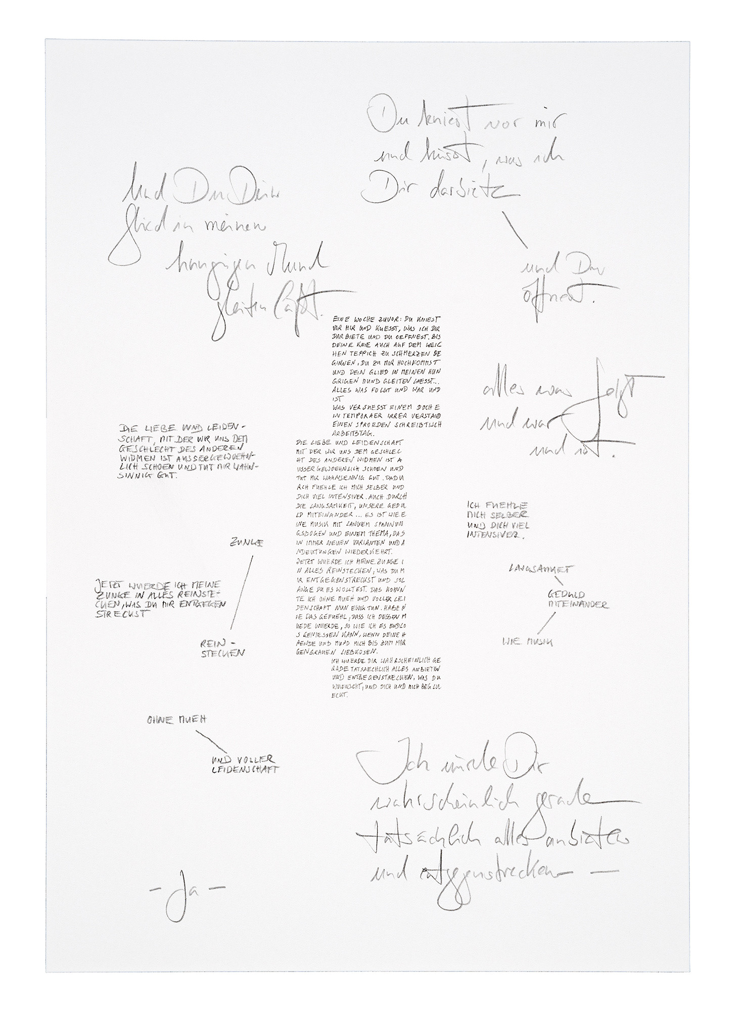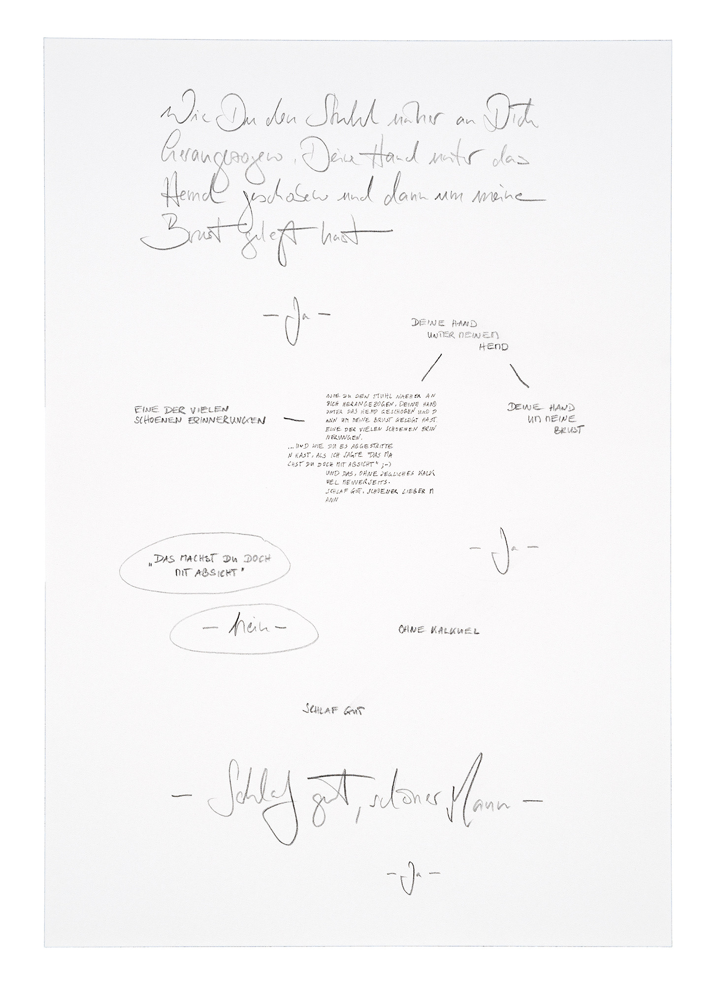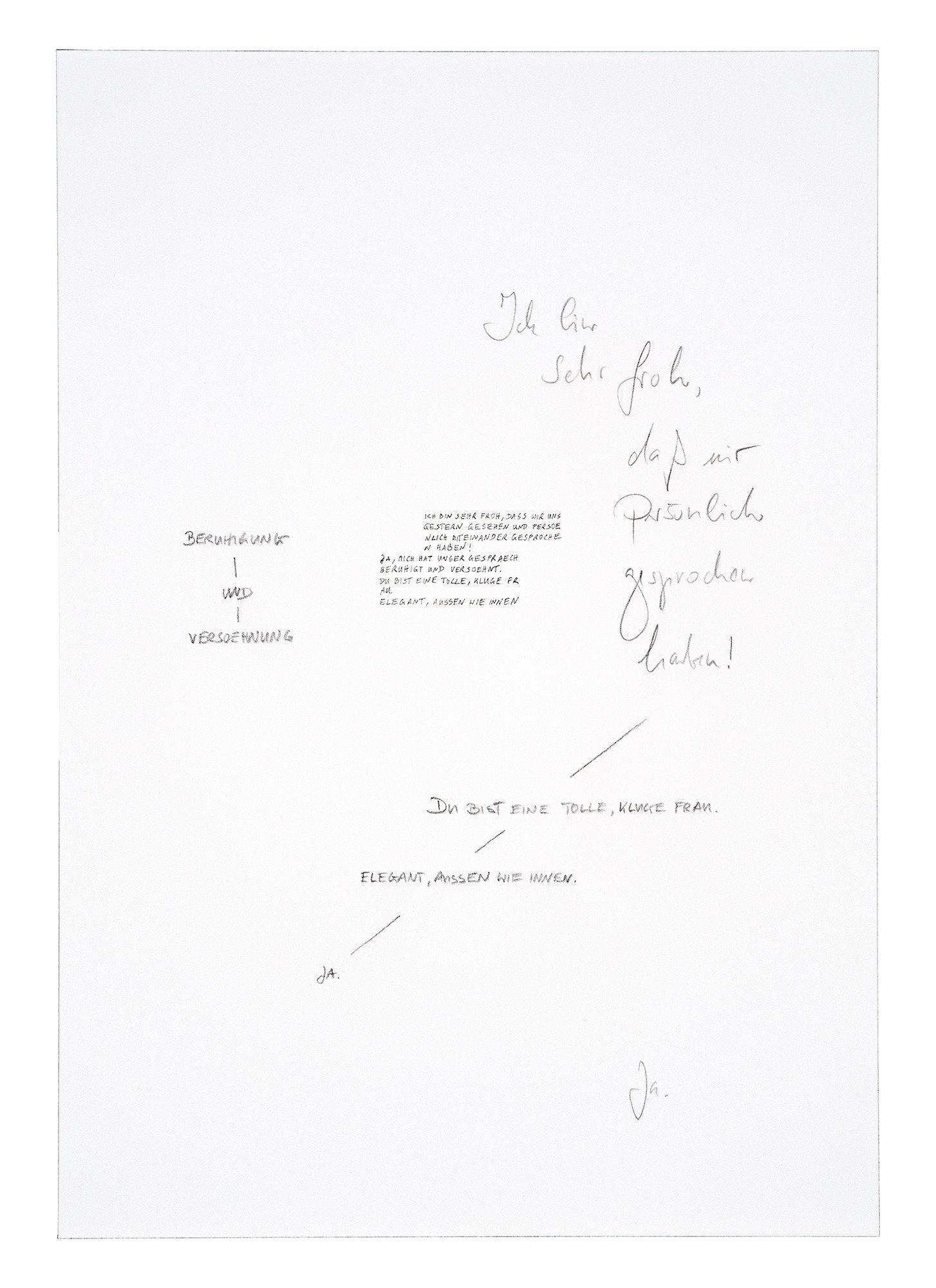 Diese dreiteilige Arbeit "o.T. (Verblendung I- III) ist eine Huldigung der Wunder und des Kummers zwischenmenschlicher Begegnungen. In der Arbeit fließen verschiedene Schriftebenen ineinander, die unter anderem die zwei Charaktere der Erzählung symbolisieren. Ausgehend von einer Kommunikation zwischen zwei Personen, die fragmenthaft in 1mm hoher, feiner Schrift mit Tusche in das Zentrum des Blattes gesetzt ist, wird im Verlauf der Serie deren Geschichte als Liebespaar erzählt. Um dieses Zentrum herum stehen in Bleistift geschriebene weitere Zitate. In Druckschrift die Zitate des Mannes, in Schreibschrift die der Frau. Zum Teil werden sie miteinander verbunden.