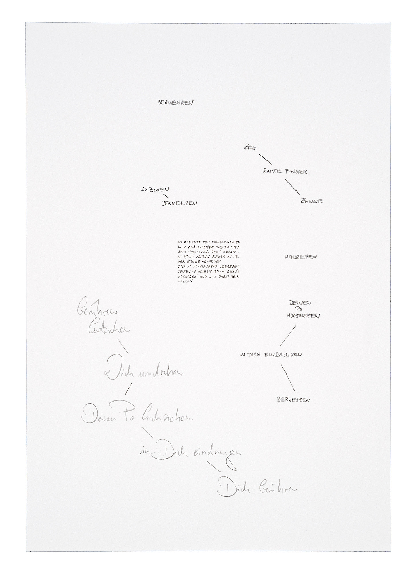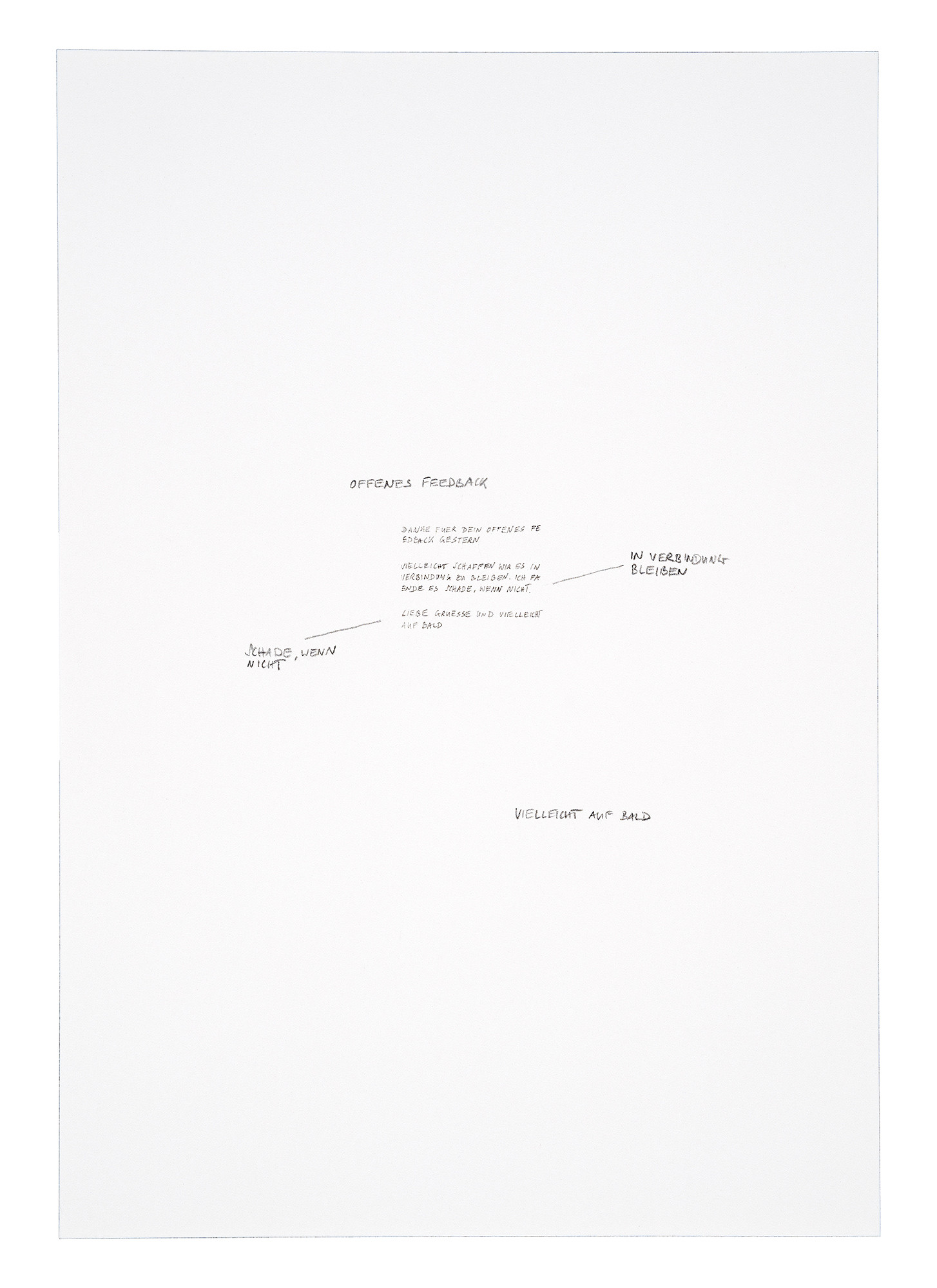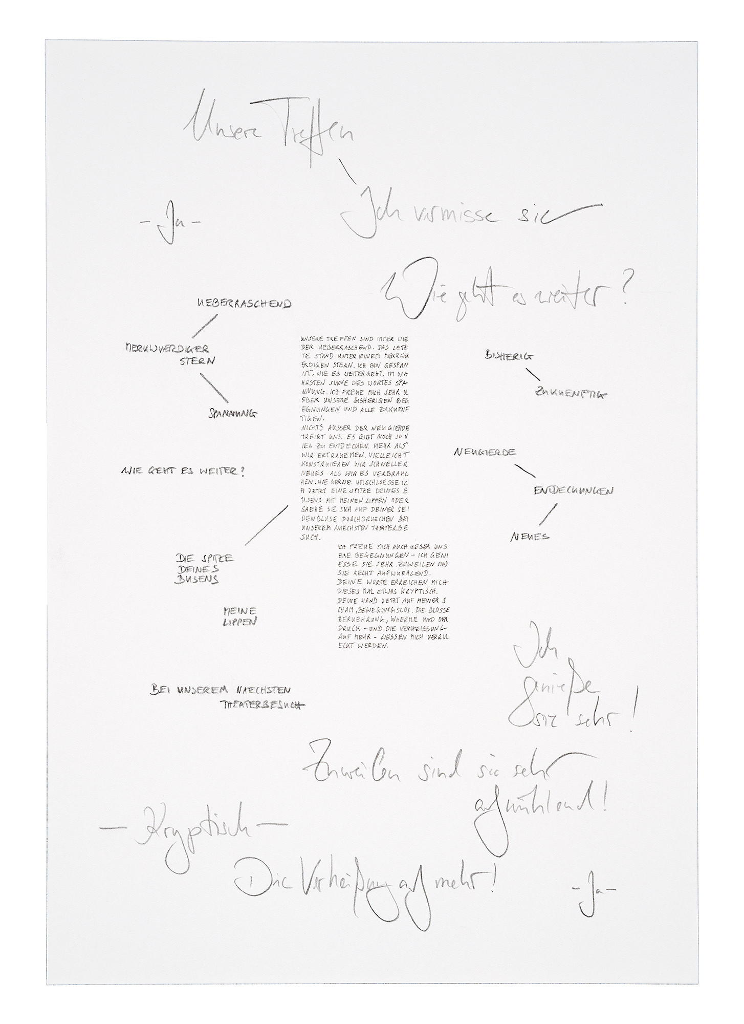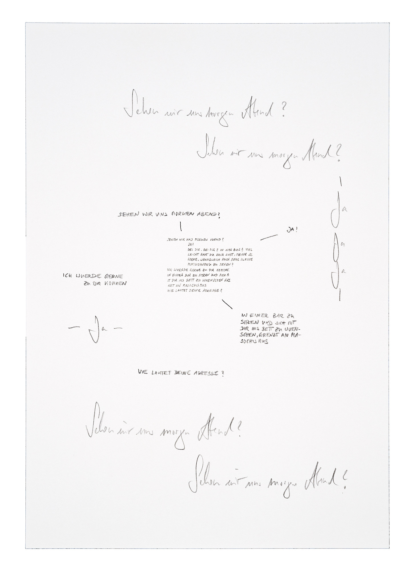 Diese dreiteilige Arbeit "o.T. (Verblendung I- III) ist eine Huldigung der Wunder und des Kummers zwischenmenschlicher Begegnungen. In der Arbeit fließen verschiedene Schriftebenen ineinander, die unter anderem die zwei Charaktere der Erzählung symbolisieren. Ausgehend von einer Kommunikation zwischen zwei Personen, die fragmenthaft in 1mm hoher, feiner Schrift mit Tusche in das Zentrum des Blattes gesetzt ist, wird im Verlauf der Serie deren Geschichte als Liebespaar erzählt. Um dieses Zentrum herum stehen in Bleistift geschriebene weitere Zitate. In Druckschrift die Zitate des Mannes, in Schreibschrift die der Frau. Zum Teil werden sie miteinander verbunden.