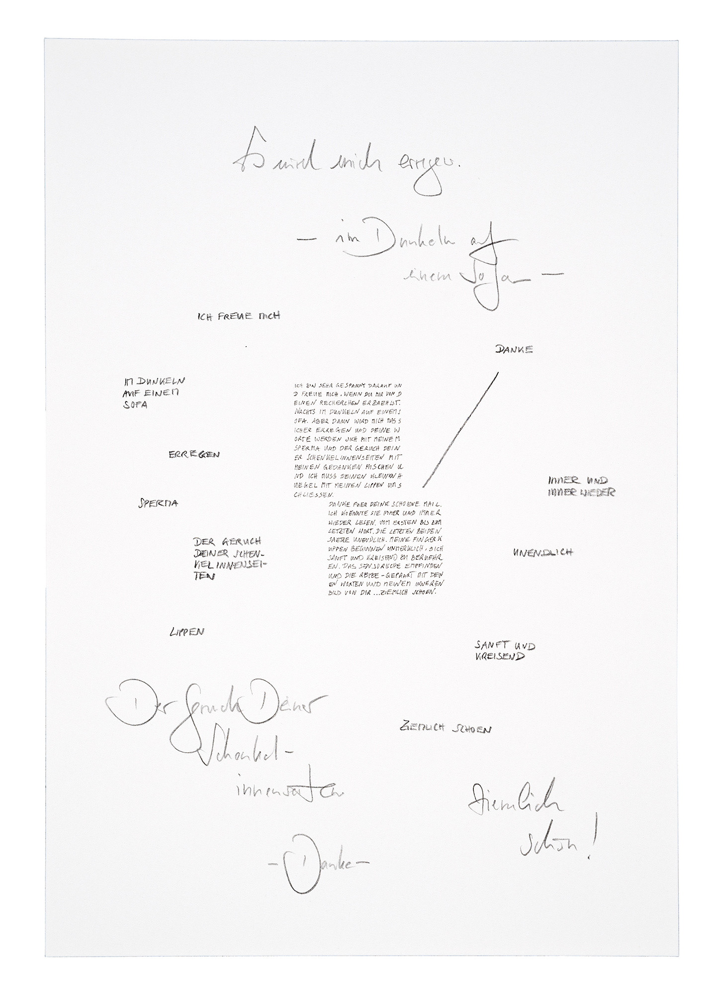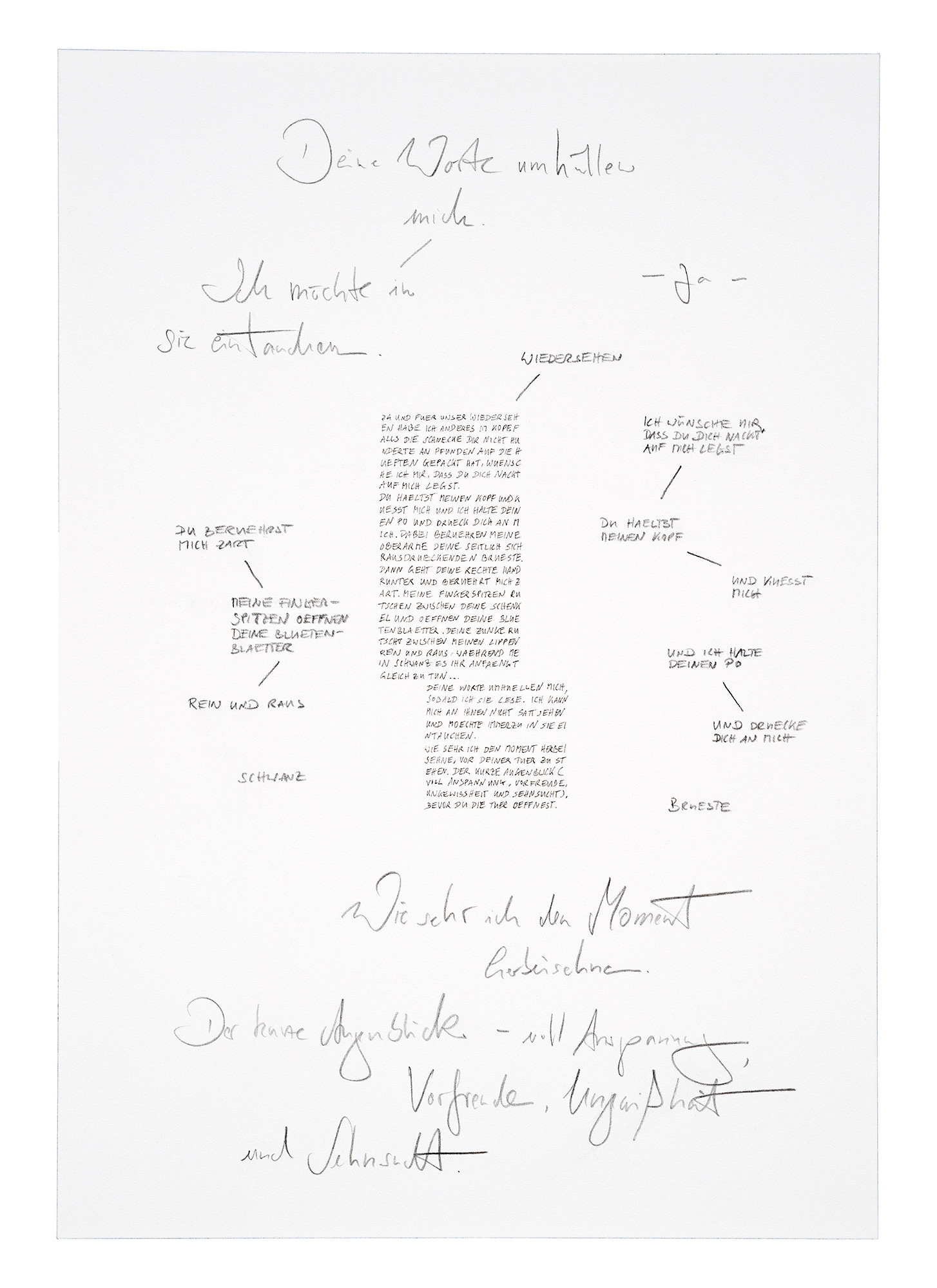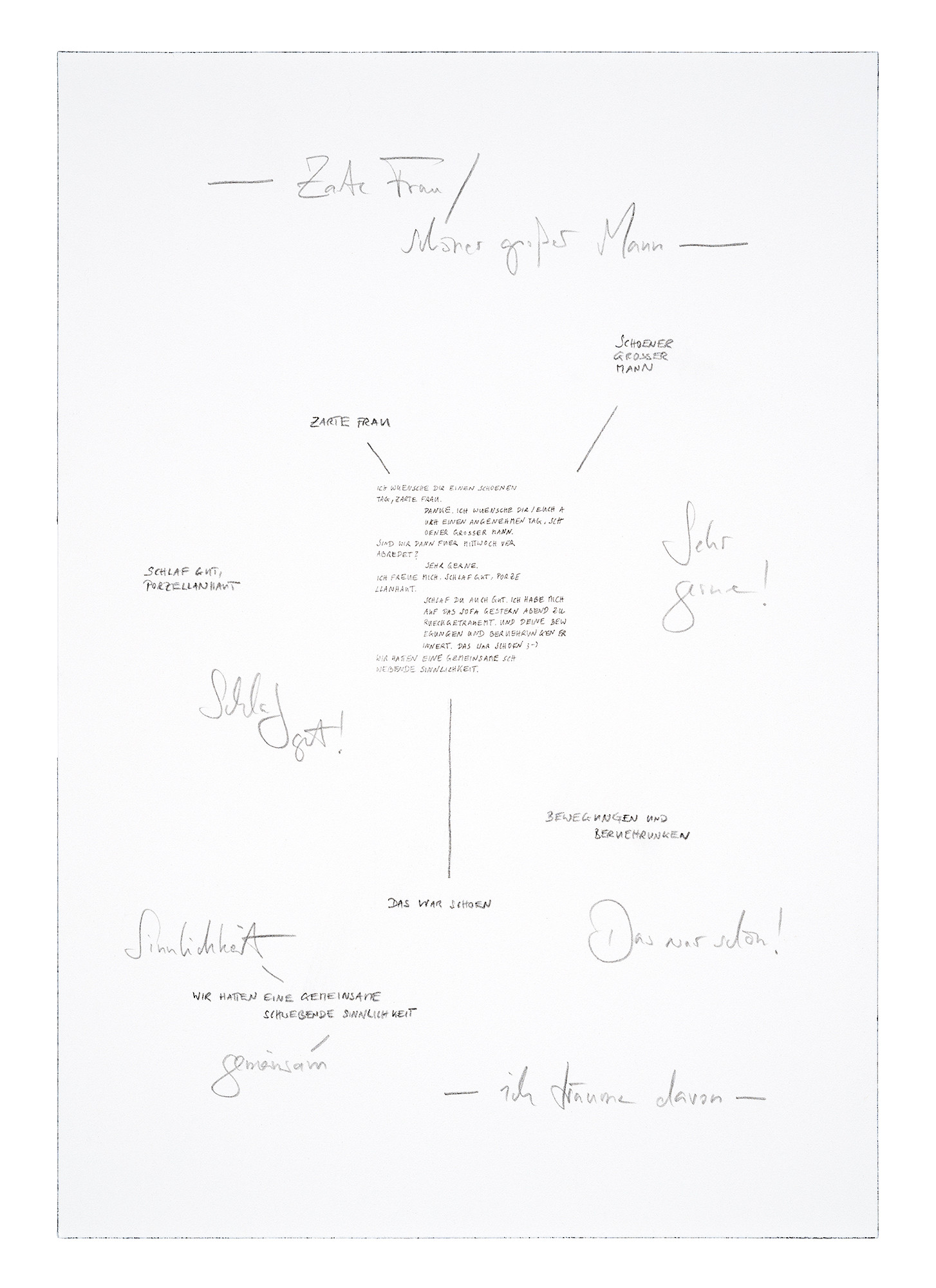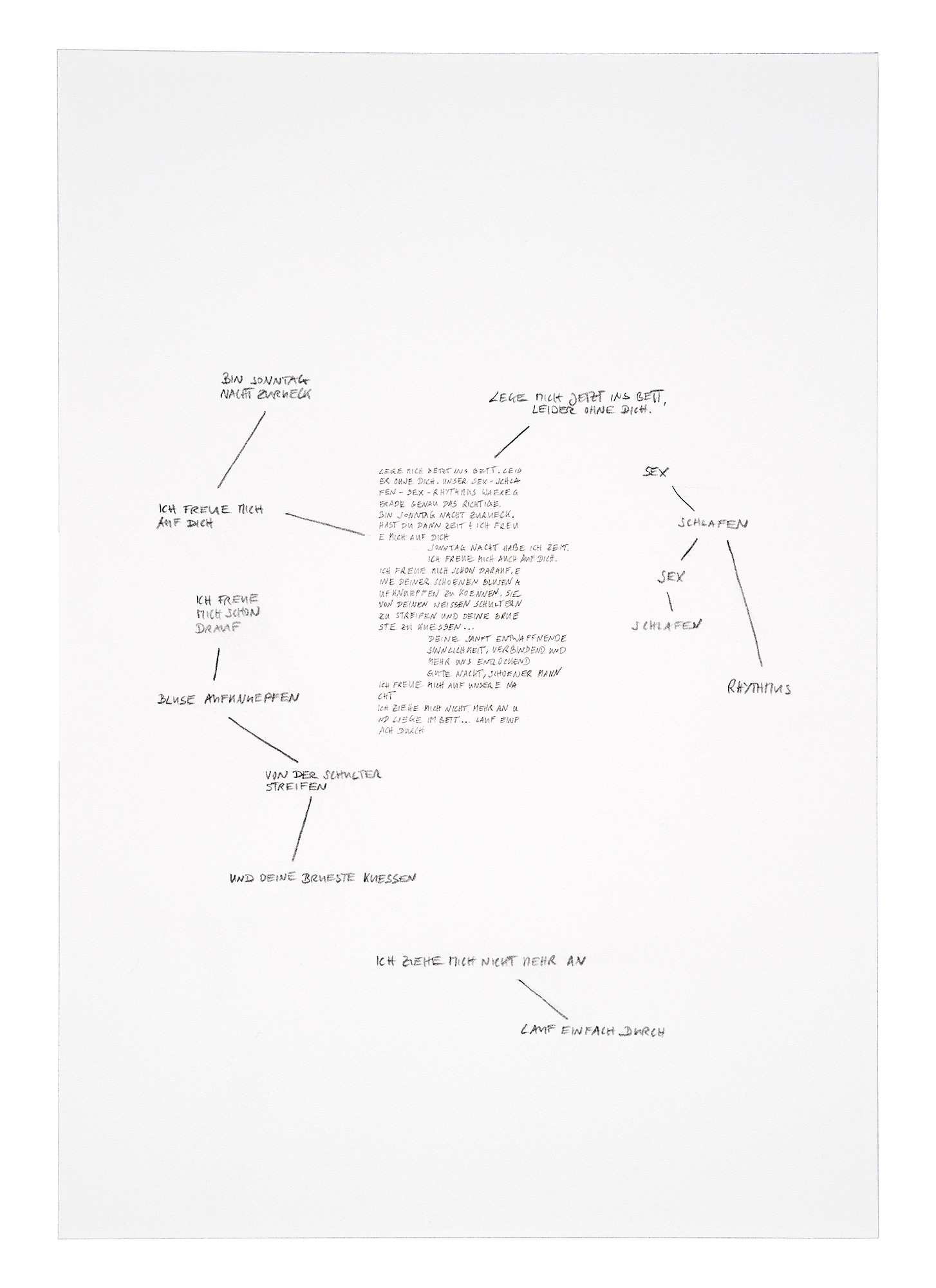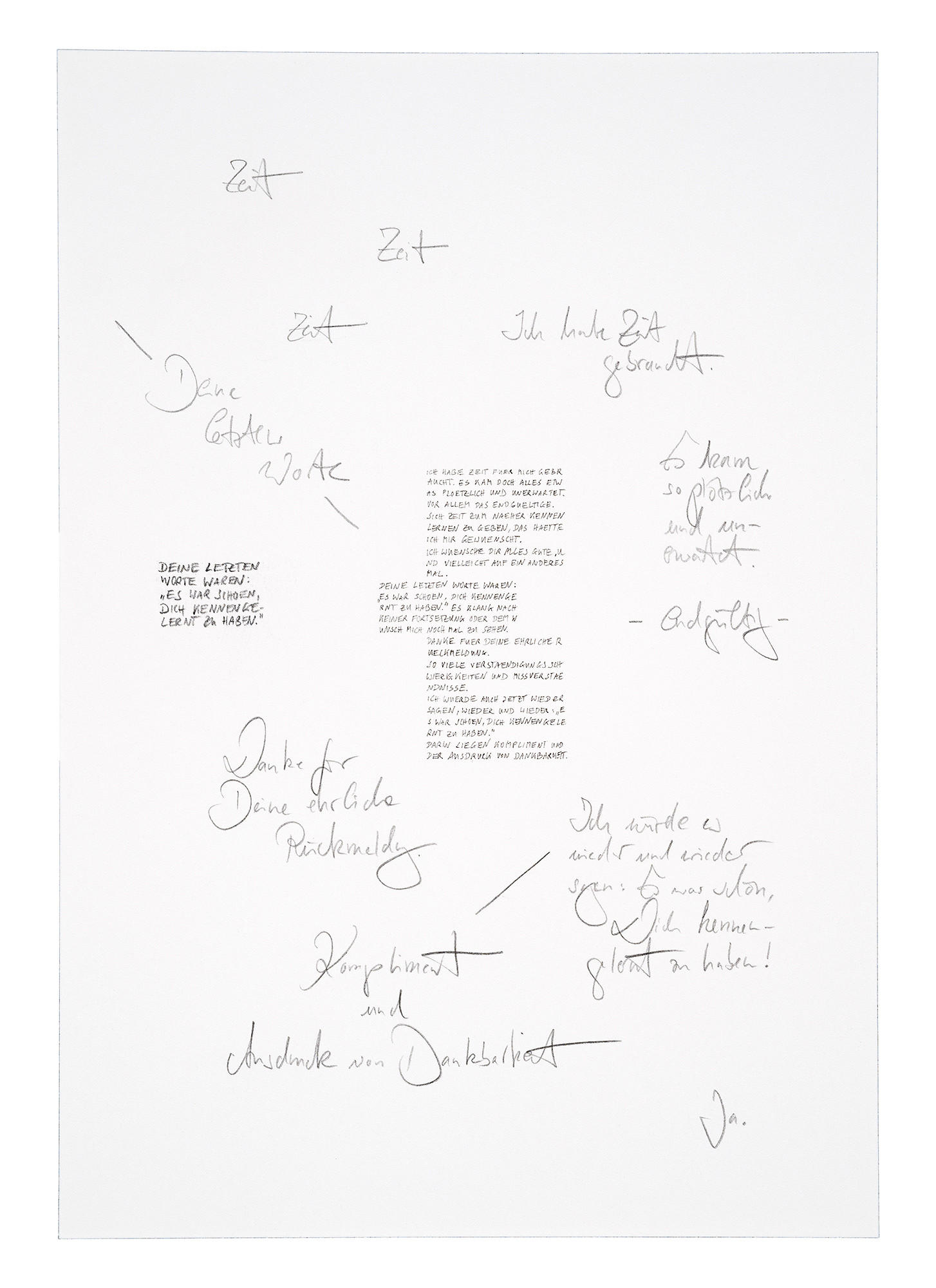 Diese dreiteilige Arbeit "o.T. (Verblendung I- III) ist eine Huldigung der Wunder und des Kummers zwischenmenschlicher Begegnungen. In der Arbeit fließen verschiedene Schriftebenen ineinander, die unter anderem die zwei Charaktere der Erzählung symbolisieren. Ausgehend von einer Kommunikation zwischen zwei Personen, die fragmenthaft in 1mm hoher, feiner Schrift mit Tusche in das Zentrum des Blattes gesetzt ist, wird im Verlauf der Serie deren Geschichte als Liebespaar erzählt. Um dieses Zentrum herum stehen in Bleistift geschriebene weitere Zitate. In Druckschrift die Zitate des Mannes, in Schreibschrift die der Frau. Zum Teil werden sie miteinander verbunden.