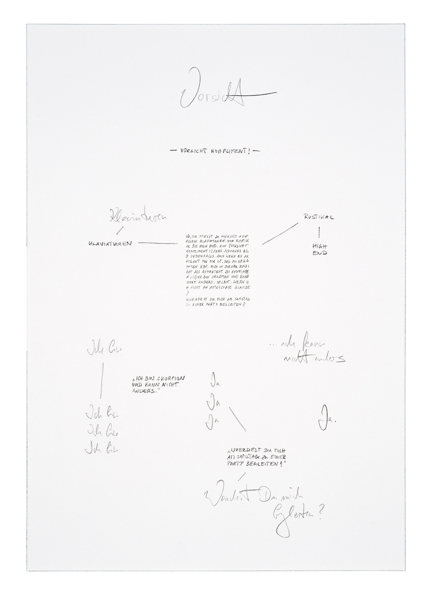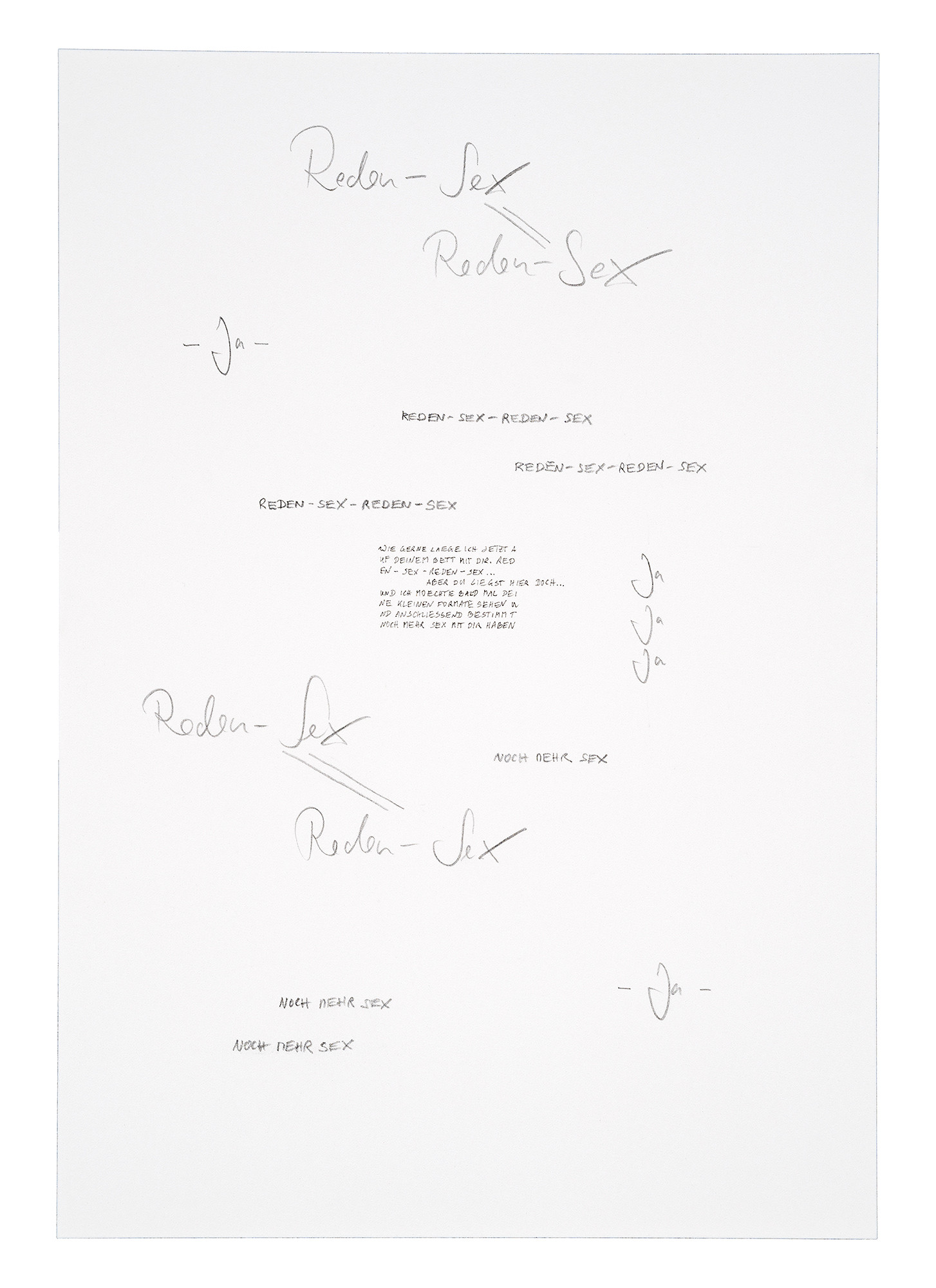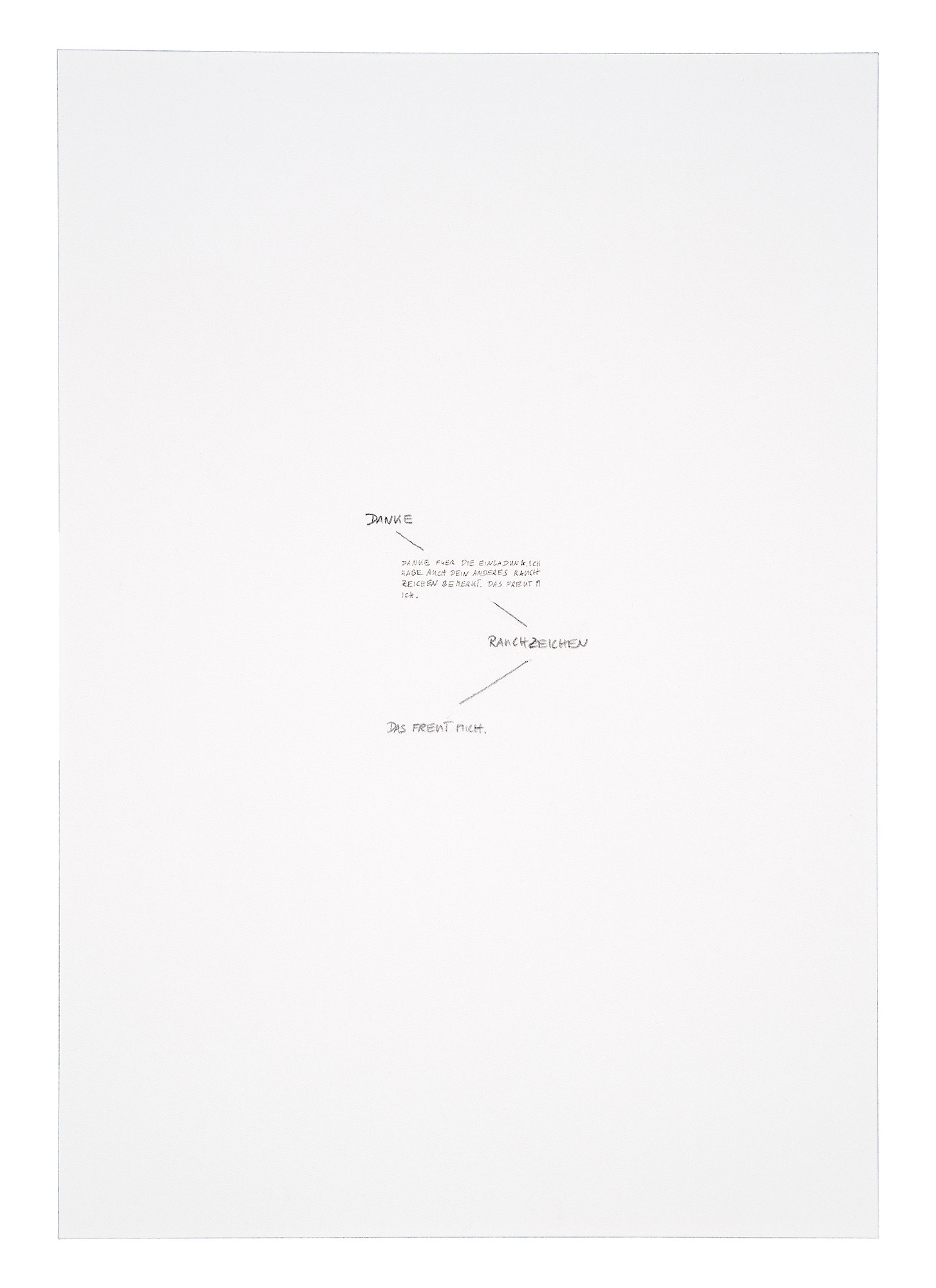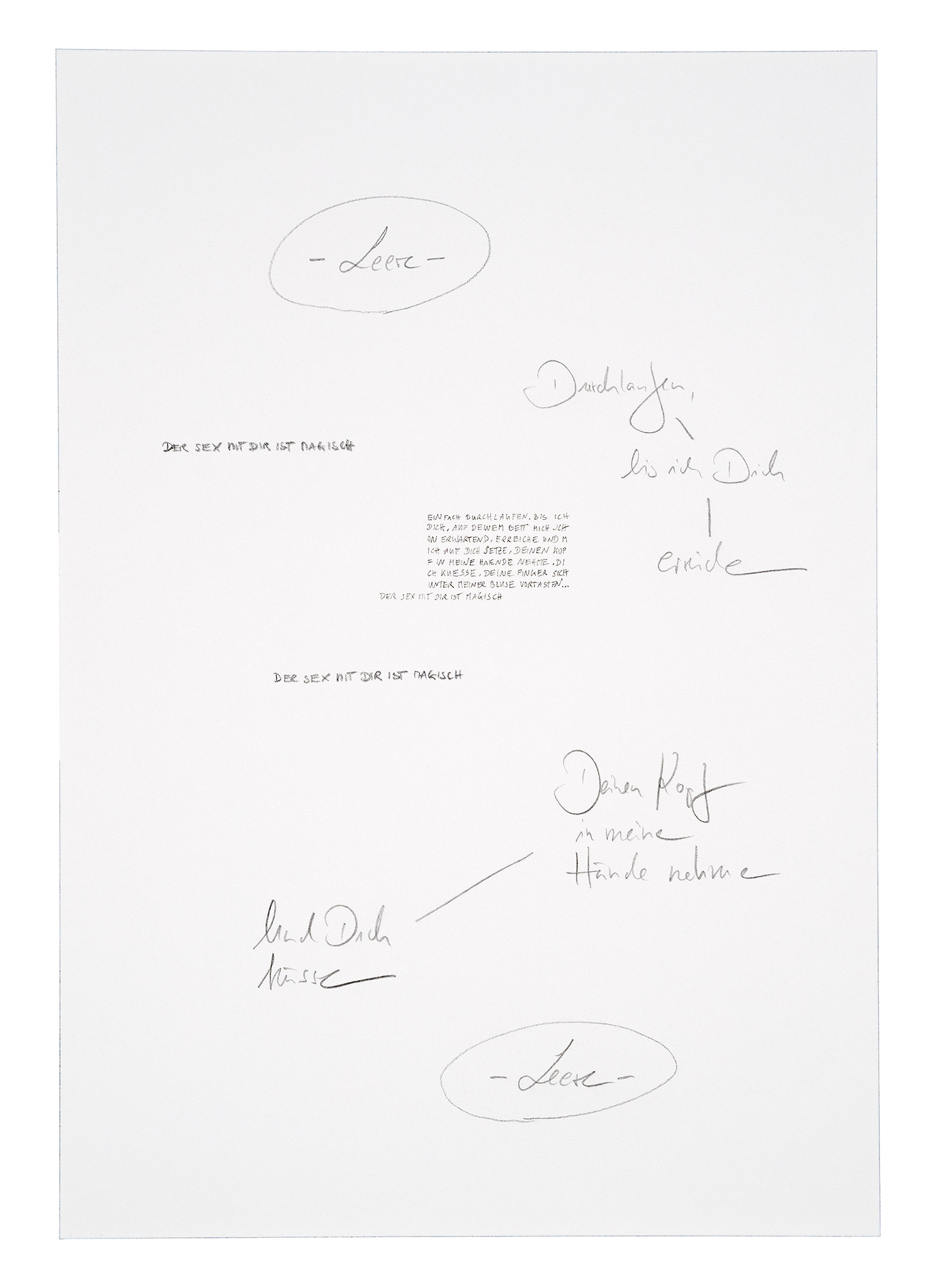 Diese dreiteilige Arbeit "o.T. (Verblendung I- III) ist eine Huldigung der Wunder und des Kummers zwischenmenschlicher Begegnungen. In der Arbeit fließen verschiedene Schriftebenen ineinander, die unter anderem die zwei Charaktere der Erzählung symbolisieren. Ausgehend von einer Kommunikation zwischen zwei Personen, die fragmenthaft in 1mm hoher, feiner Schrift mit Tusche in das Zentrum des Blattes gesetzt ist, wird im Verlauf der Serie deren Geschichte als Liebespaar erzählt. Um dieses Zentrum herum stehen in Bleistift geschriebene weitere Zitate. In Druckschrift die Zitate des Mannes, in Schreibschrift die der Frau. Zum Teil werden sie miteinander verbunden.