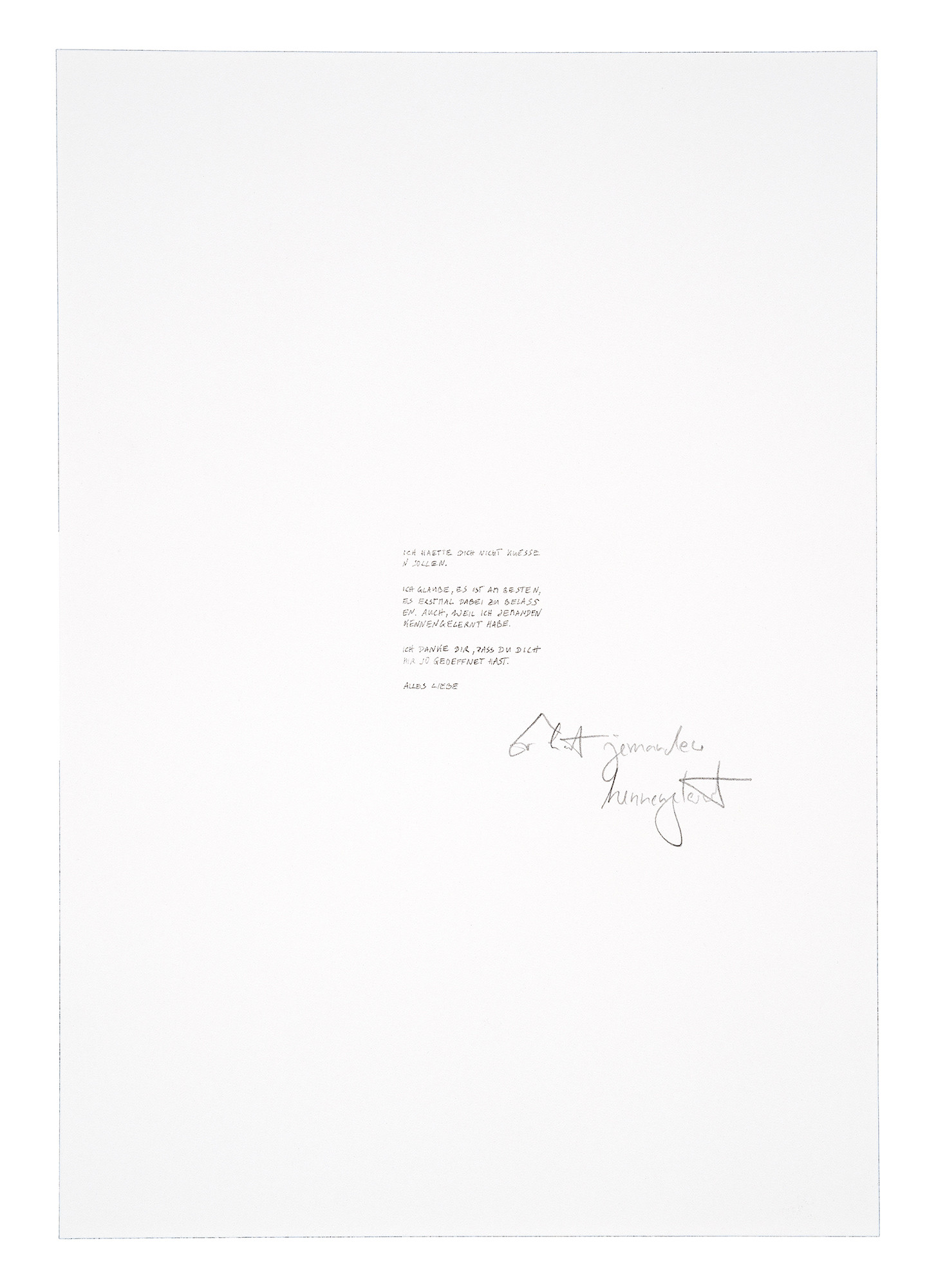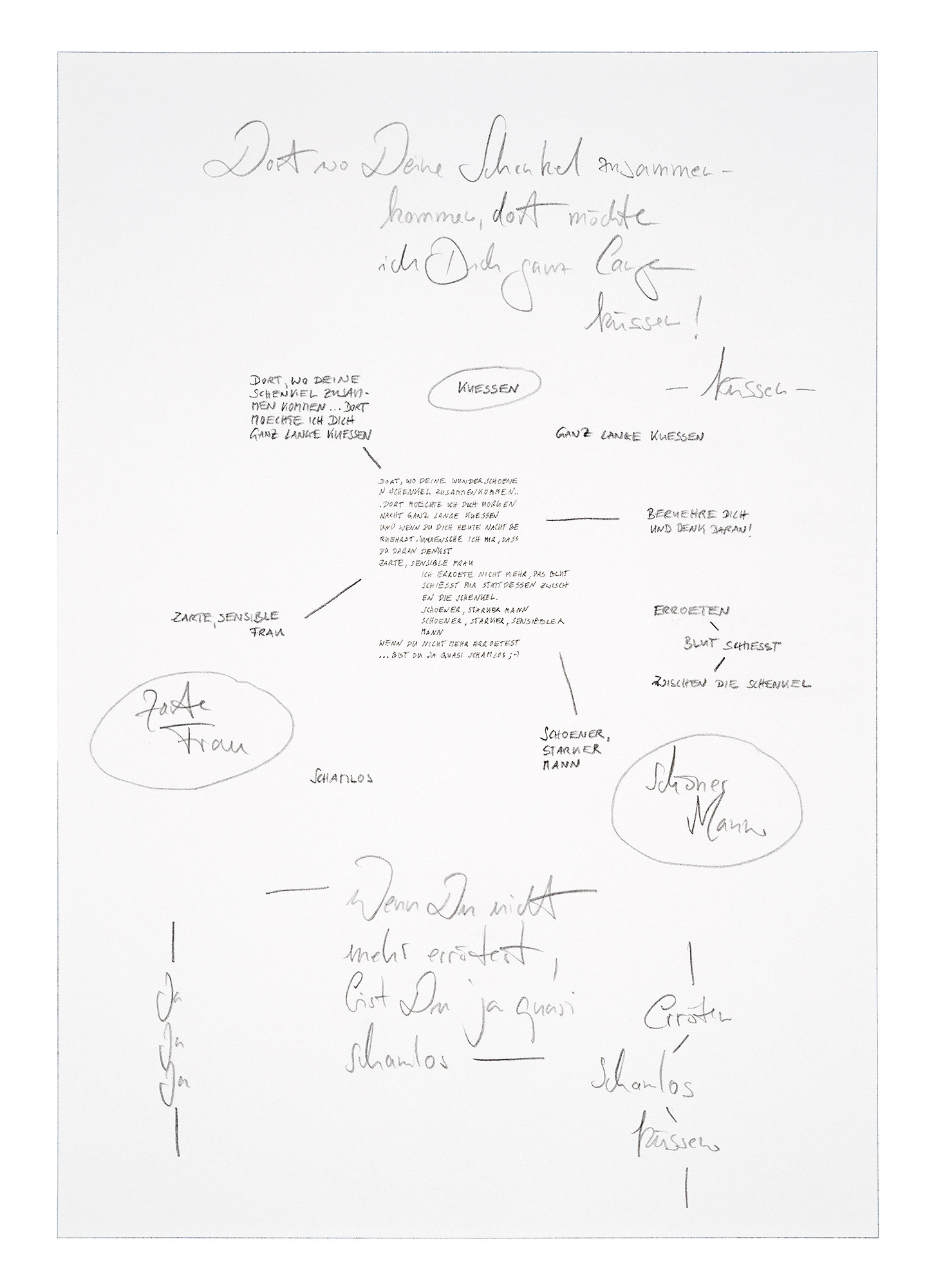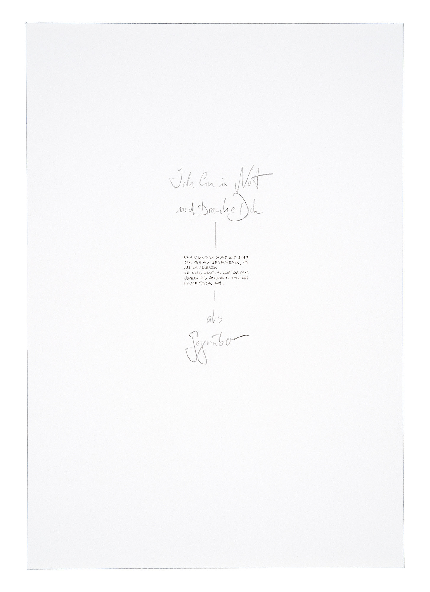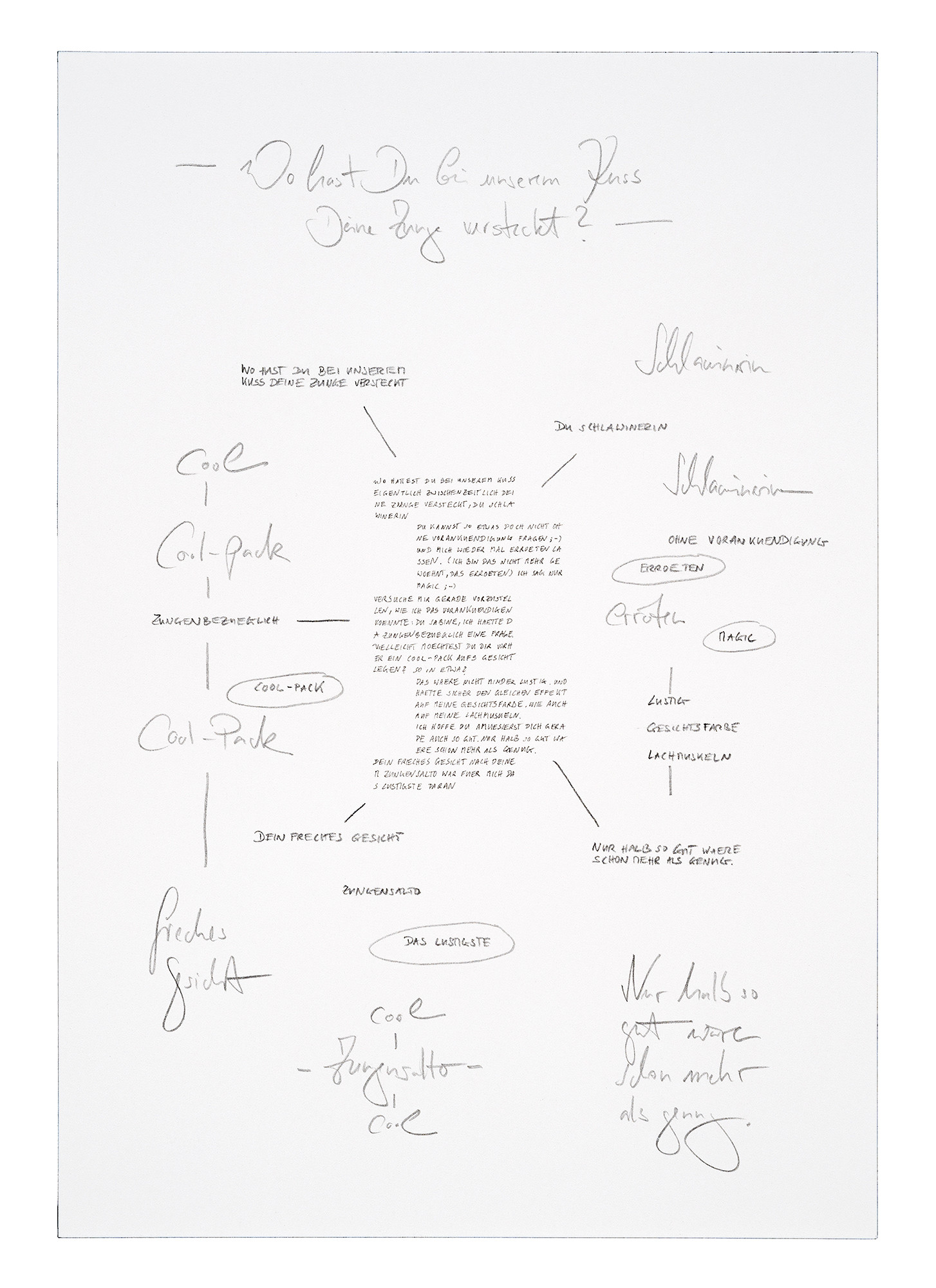 Diese dreiteilige Arbeit "o.T. (Verblendung I- III) ist eine Huldigung der Wunder und des Kummers zwischenmenschlicher Begegnungen. In der Arbeit fließen verschiedene Schriftebenen ineinander, die unter anderem die zwei Charaktere der Erzählung symbolisieren. Ausgehend von einer Kommunikation zwischen zwei Personen, die fragmenthaft in 1mm hoher, feiner Schrift mit Tusche in das Zentrum des Blattes gesetzt ist, wird im Verlauf der Serie deren Geschichte als Liebespaar erzählt. Um dieses Zentrum herum stehen in Bleistift geschriebene weitere Zitate. In Druckschrift die Zitate des Mannes, in Schreibschrift die der Frau. Zum Teil werden sie miteinander verbunden.